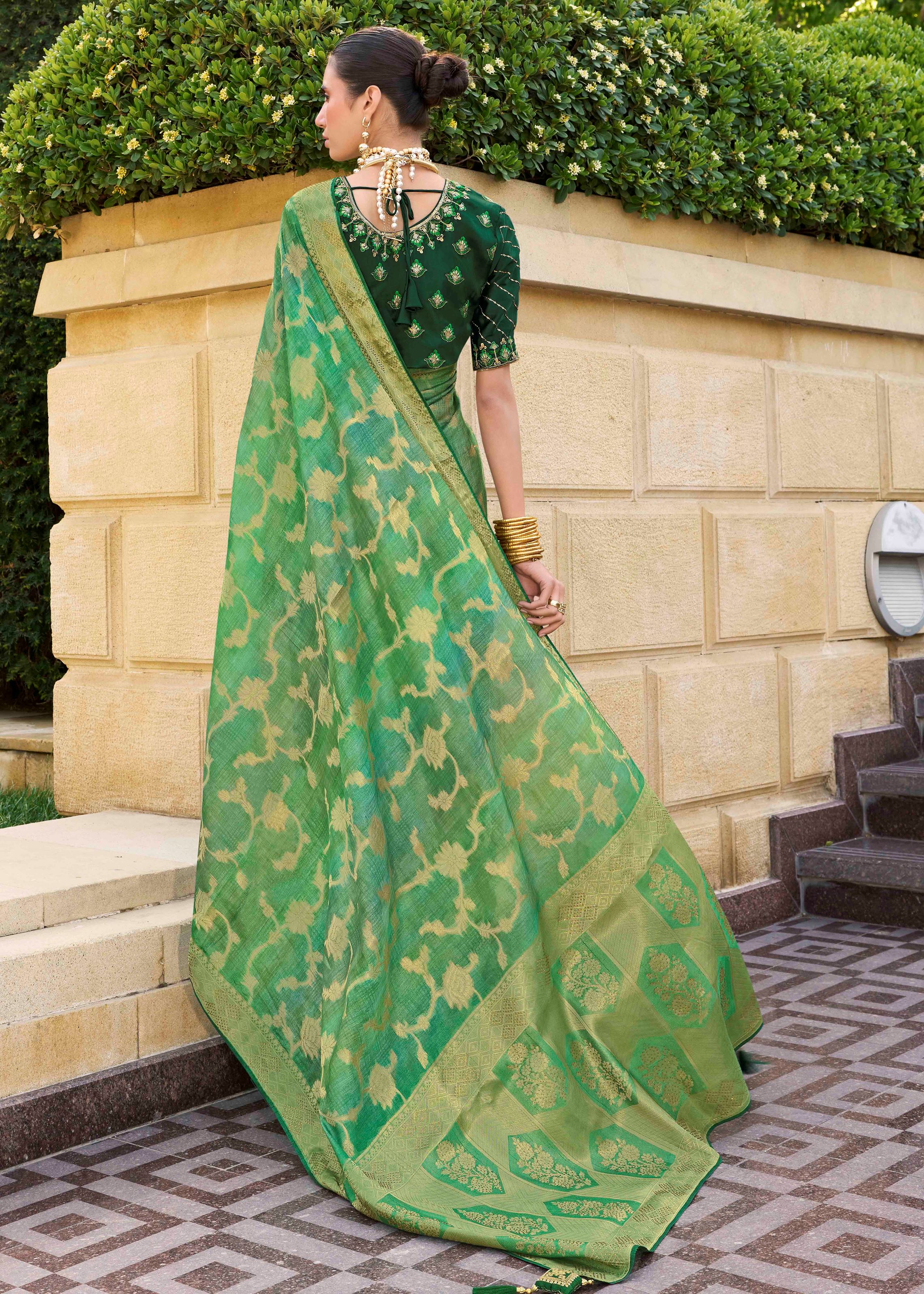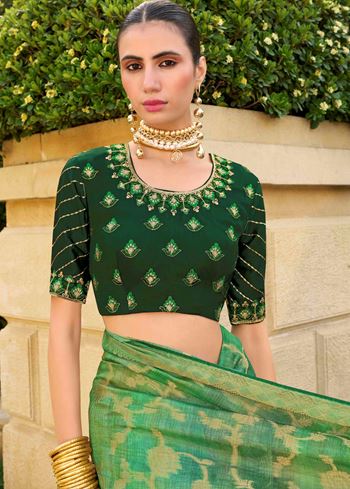 Green Jacquard Silk Woven Saree With Embroidered Blouse