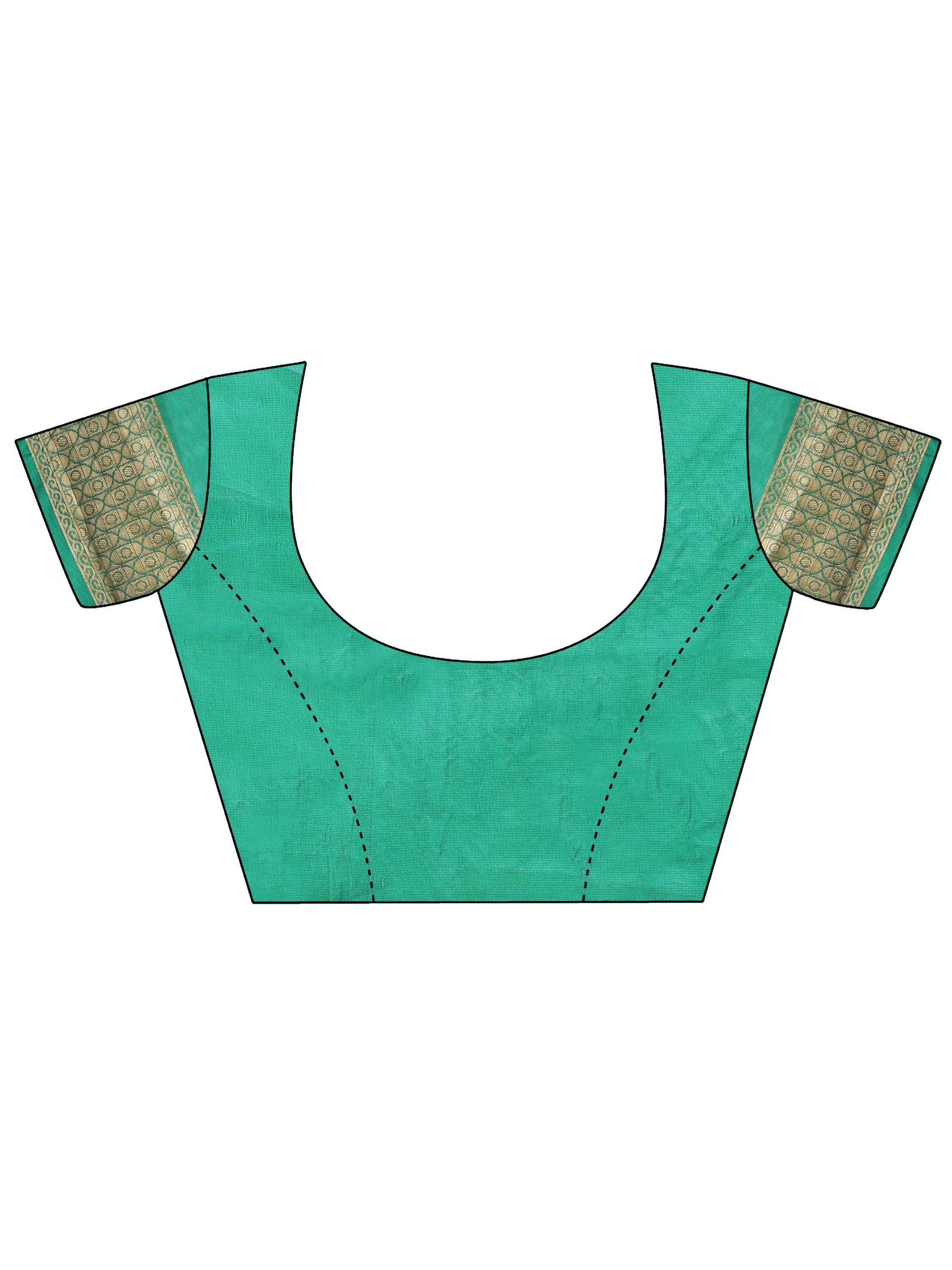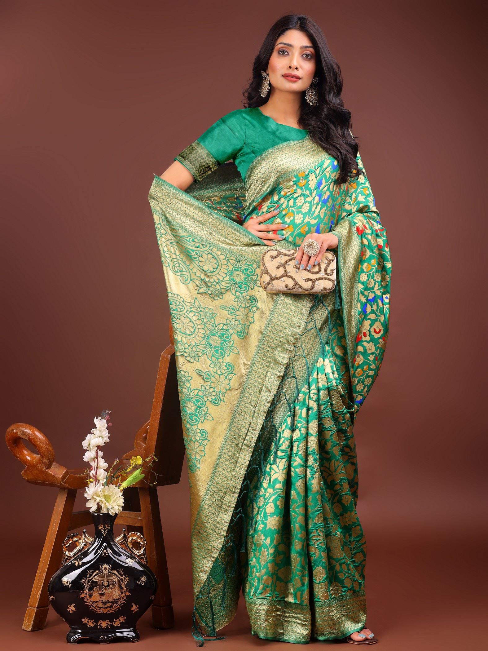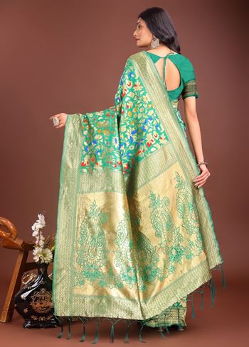 The refreshing green hue symbolizes prosperity, vibrance, and grace, making it an ideal choice for those who love to stand out while retaining a traditional essence. The woven patterns highlight delicate craftsmanship, adding depth and richness to the overall look. Whether styled with heavy traditional jewelry or kept simple with elegant accessories, this saree ensures a stunning presence.