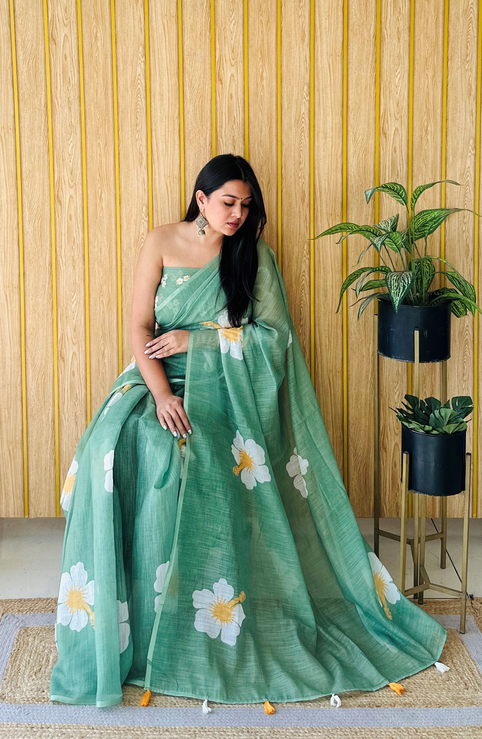 Green Linen Floral Printed Girlie Looks Saree