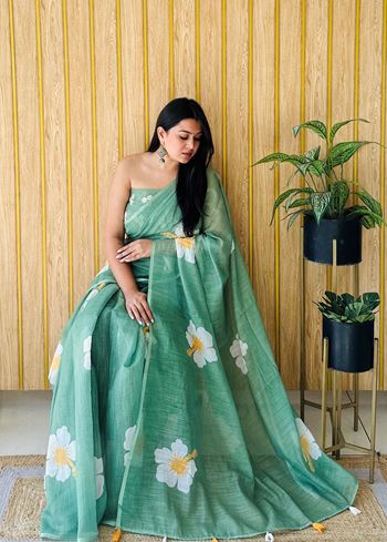 Accompanied by a matching green linen blouse fabric, it allows you to experiment with different blouse patterns—from chic sleeveless cuts to elegant traditional styles—enhancing its versatility. Pair it with subtle jewelry for a simple day look or accessorize with bold earrings and bangles to create a standout festive ensemble.Whether you are heading to a casual brunch, a family get-together, or a light festive gathering, the Green Linen Floral Printed Saree adds a refreshing charm to your style. It’s more than just attire—it’s a celebration of effortless elegance, youthful beauty, and timeless appeal.
