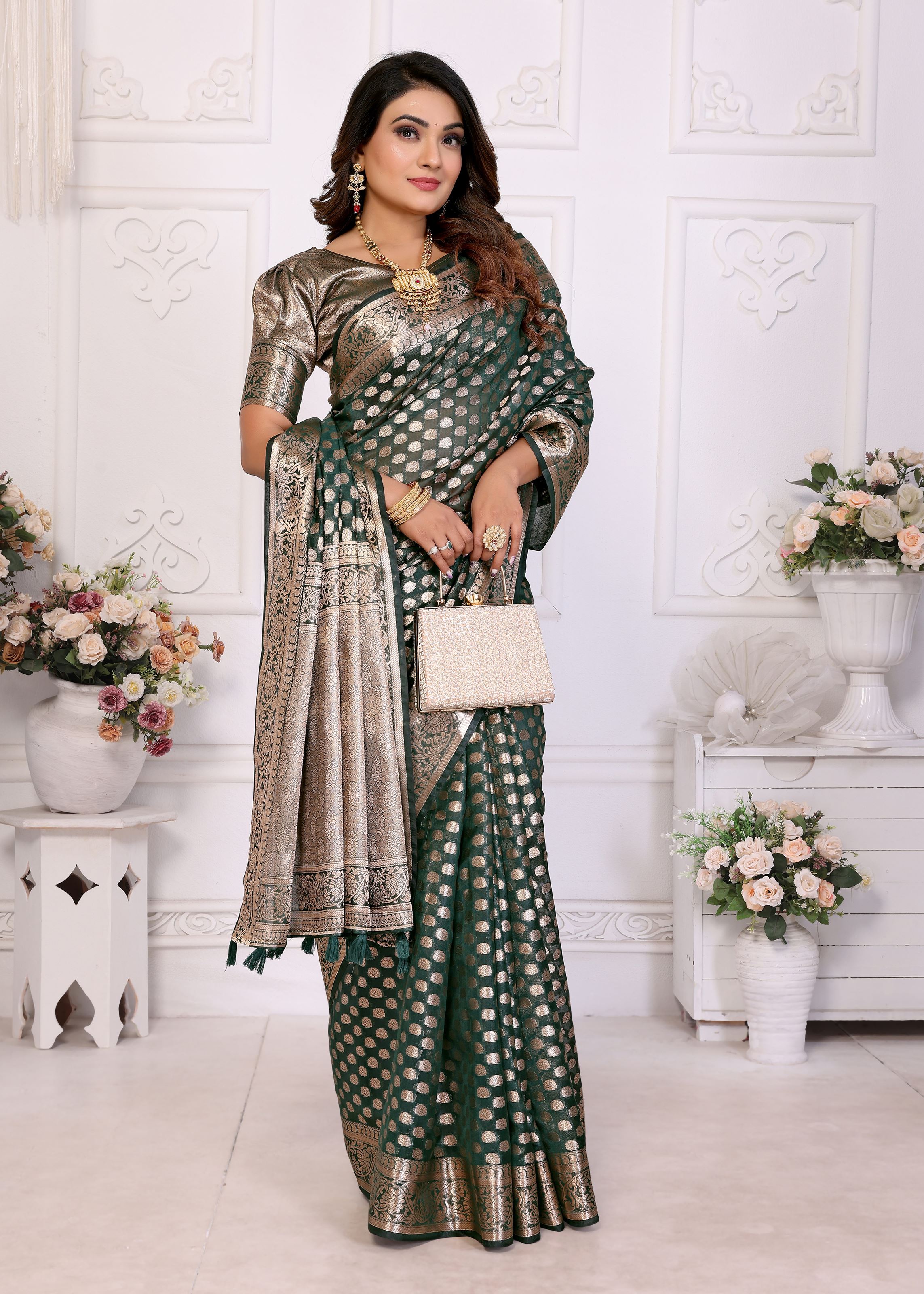 The enchanting green hue symbolizes prosperity and freshness, while the shimmering gold zari woven motifs add a royal touch that enhances its festive appeal. Each detail has been carefully designed to capture the light, giving the saree a luminous charm that exudes luxury. The graceful balance of vibrant green and radiant gold makes this piece a standout addition to any ceremonial wardrobe.
