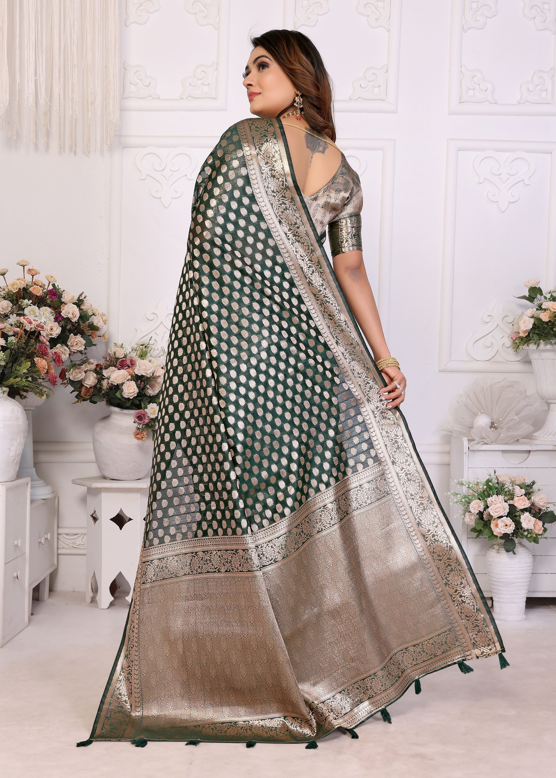Accompanied by a matching green organza blouse fabric, this saree allows you to customize the blouse design—whether you prefer a traditional style or a modern chic silhouette. Pair it with temple jewelry or kundan sets to elevate the grandeur, or keep it minimal with gold bangles for an understated yet elegant look.Perfect for bridesmaids, festive occasions, or cultural celebrations, the Green Organza Gold Zari Saree is a celebration of heritage woven with finesse, ensuring you radiate sophistication with every drape.