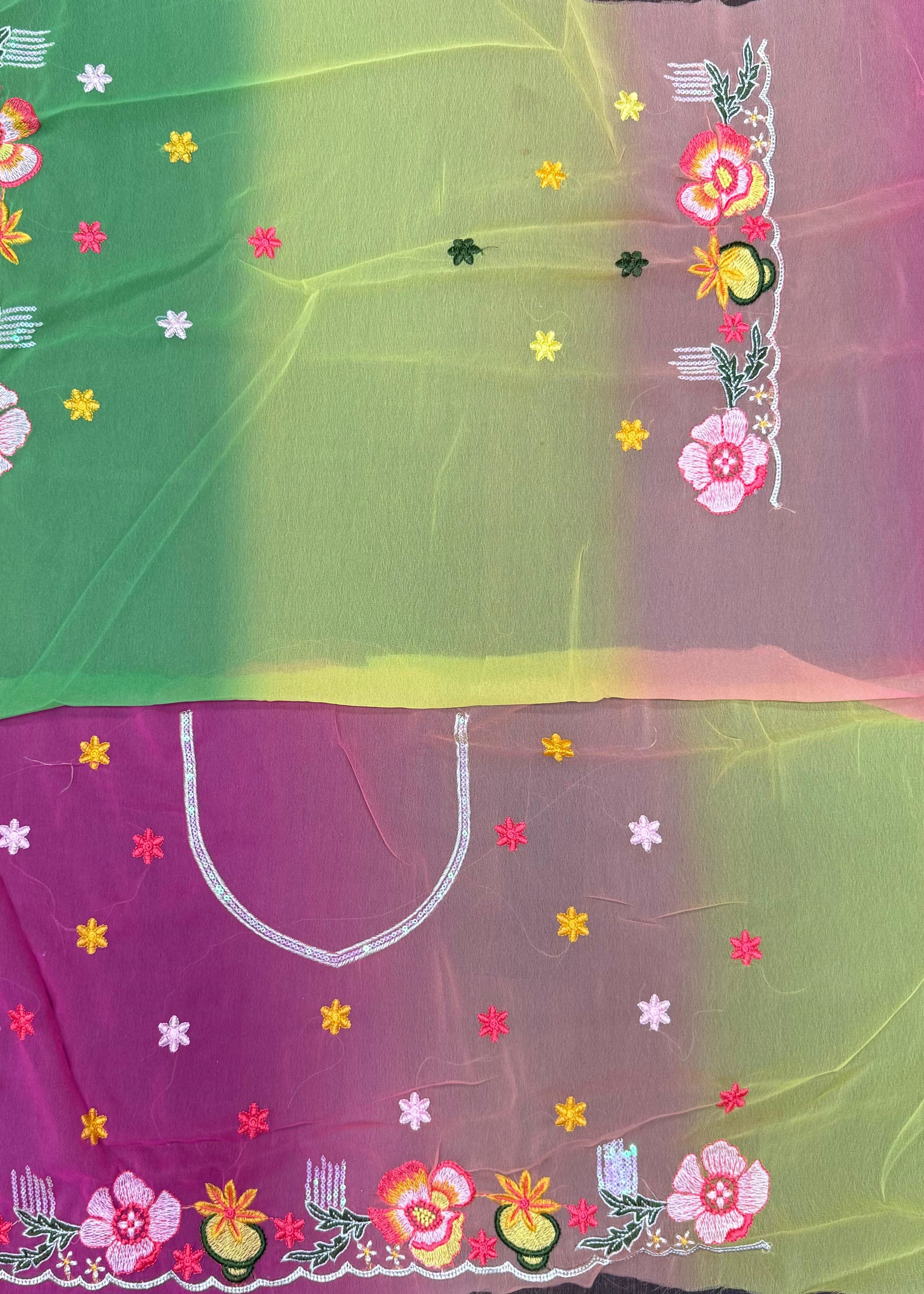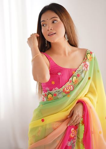 Make a statement with the Green Pedding With Embroidery Work Bollywood Style Georgette Saree, a perfect blend of ethnic tradition and modern glamour. Crafted from high-quality faux georgette, this saree drapes gracefully, providing a lightweight and comfortable feel for all-day wear. The intricate embroidery adds a touch of sophistication, reflecting exquisite craftsmanship inspired by Bollywood-style elegance. Paired with a contrasting pink faux georgette blouse, this ready-to-wear saree ensures a stylish and coordinated look without any stitching hassle.