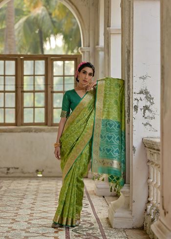 Paired with a matching green silk blend blouse, this saree presents a cohesive and elegant look. The rich green hue exudes sophistication and vibrancy, perfect for making a statement at any ceremonial or festive event. Its designer-inspired weaving and detailed texture enhance the saree’s opulence, making it a versatile choice for both daytime and evening occasions.