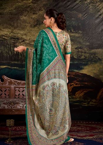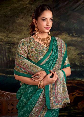 Celebrate vibrant tradition with our Green Silk Saree, beautifully adorned with intricate Madhubani artwork and captivating Bandhej patterns that bring a touch of cultural magic to your wardrobe. Crafted from luxurious green silk fabric, this saree offers a rich texture and elegant drape. Paired with a contrasting off-white silk blouse, the ensemble strikes a perfect balance between boldness and subtlety. Ideal for festive occasions, weddings, or cultural celebrations, this saree is a stunning blend of heritage artistry and modern elegance.