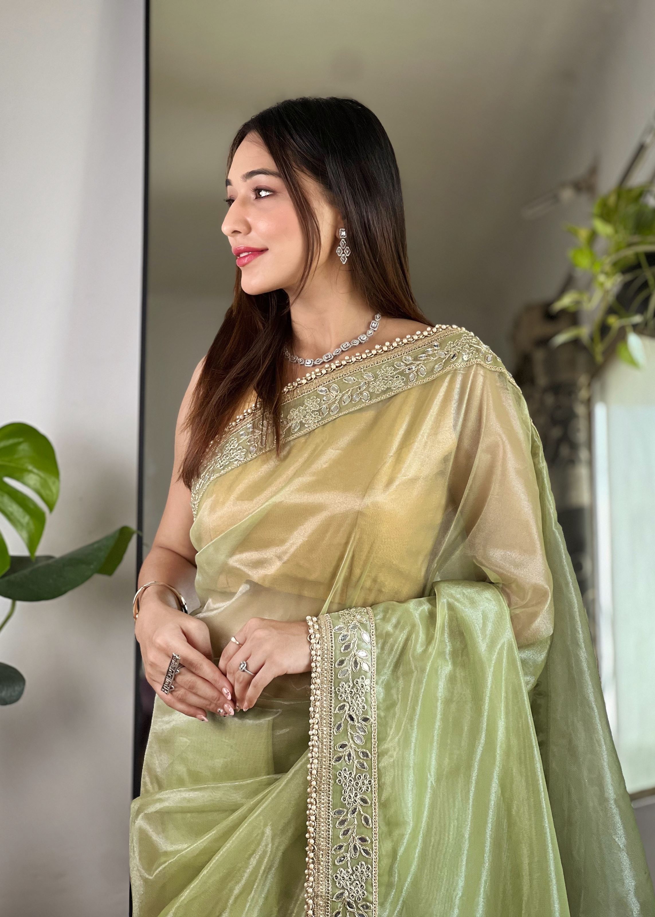 Perfect for celebrations or ceremonial occasions, this saree pairs beautifully with statement jewelry and stylish heels, enhancing its glamorous and festive appeal. The soft tissue silk fabric ensures a graceful flow while maintaining comfort and durability, allowing you to enjoy extended events with ease.Aethnofit Fashions offers worldwide shipping, enabling you to buy Indian sarees online or explore designer sarees online conveniently. Add this green silver tissue silk saree to your collection for a timeless piece that embodies festive charm, designer sophistication, and elegant craftsmanship.