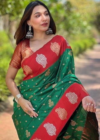 Step into elegance with the Green Soft Silk Heavy Woven Jari Designer Saree from Aethnofit Fashions. Crafted from luxurious soft silk, this saree features intricate heavy jari weaving that exudes opulence and timeless beauty. The rich green base is perfectly complemented by a striking red silk blouse, creating a captivating contrast ideal for weddings, festive occasions, or high-end parties.