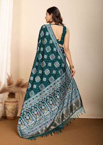 This exquisite saree is complemented by a matching green silk blouse, designed to create a perfectly coordinated ensemble. The subtle sheen of the silk fabric paired with the artistic Meenakari weaving brings forth a royal aesthetic, ensuring you stand out at every event.