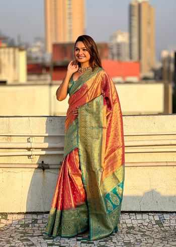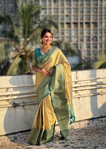 Paired with a contrasting blue silk blouse, this saree offers a sophisticated and striking look. The lightweight yet rich texture of tissue silk allows graceful draping while maintaining comfort throughout long hours of wear. Accessorize with statement jewelry, elegant heels, and ethnic accessories to complete a festive-ready ensemble that leaves a lasting impression. Designed for women who value authentic craftsmanship, this saree is ideal for special occasions where tradition meets opulence.