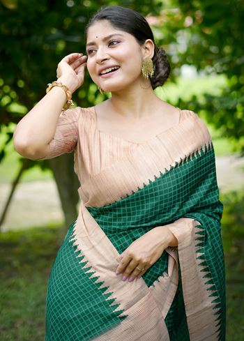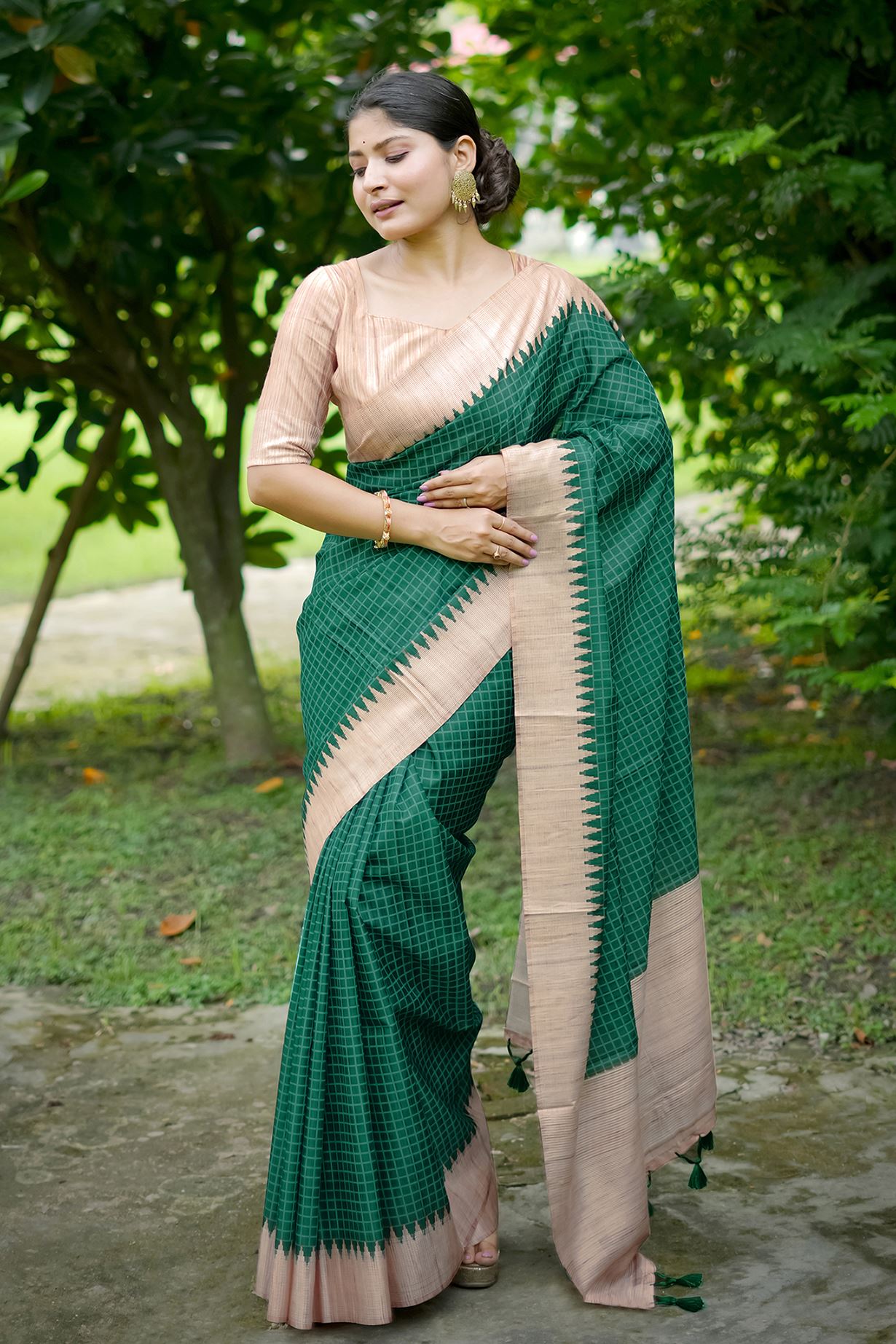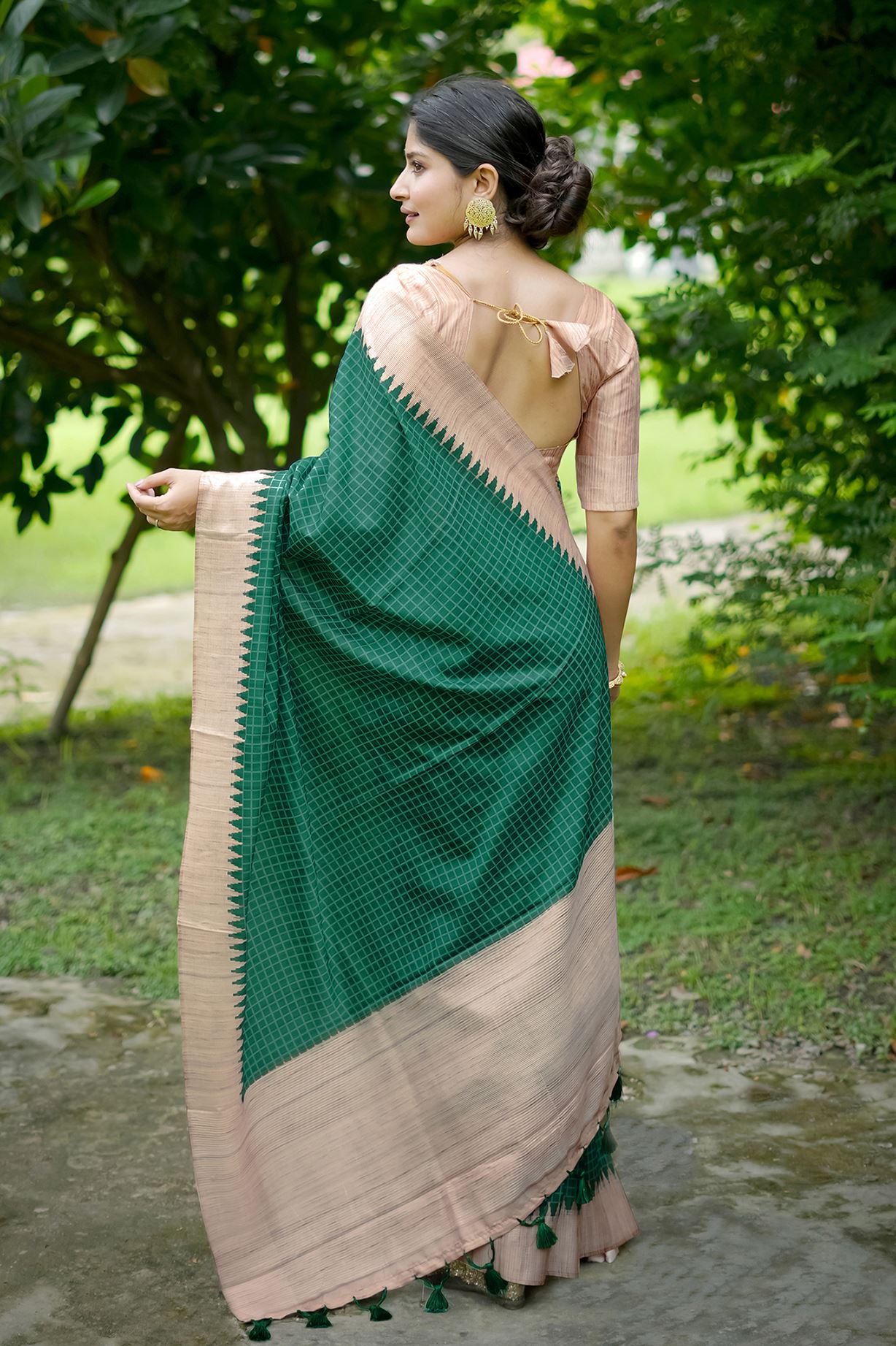 Green Tussar Silk Saree with Checks and Contrast Pallu