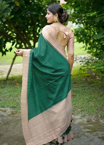 Elevate your ethnic collection with this Green Tussar Silk Saree with Checks and Contrast Pallu from Aethnofit Fashions. Woven from rich tussar silk, this saree showcases a vibrant green base adorned with fine, classic checks that offer an effortlessly regal look. The striking contrast pallu introduces a beautiful visual break, while the cream blouse in matching tussar silk enhances the overall appeal with graceful balance.