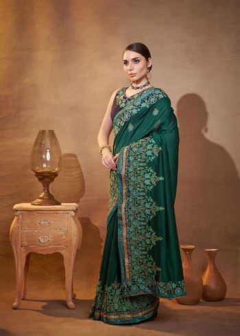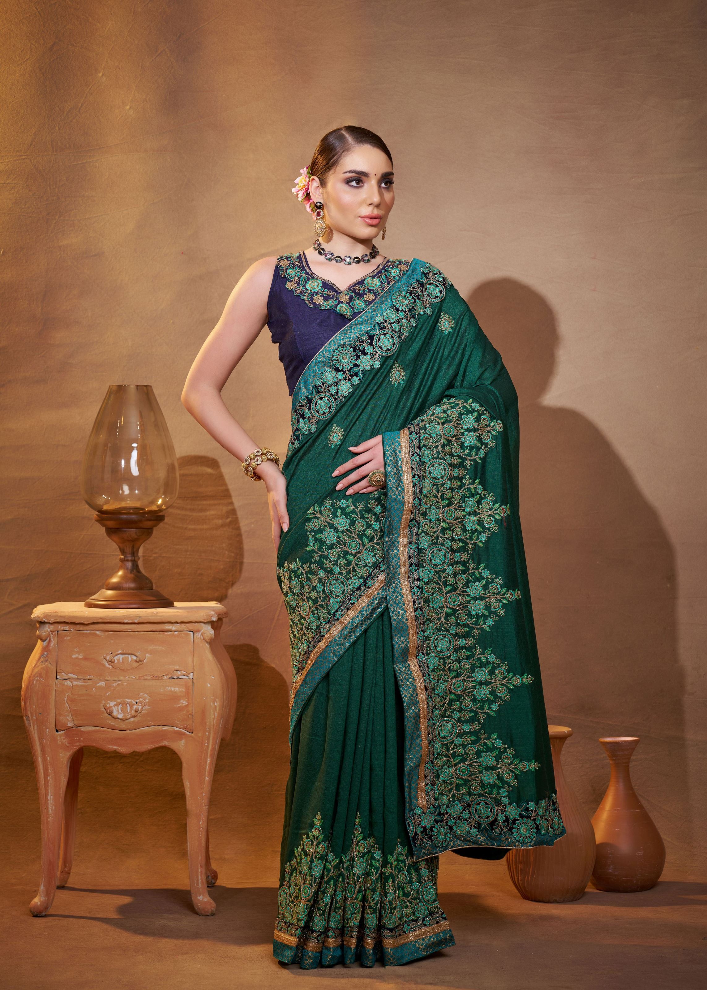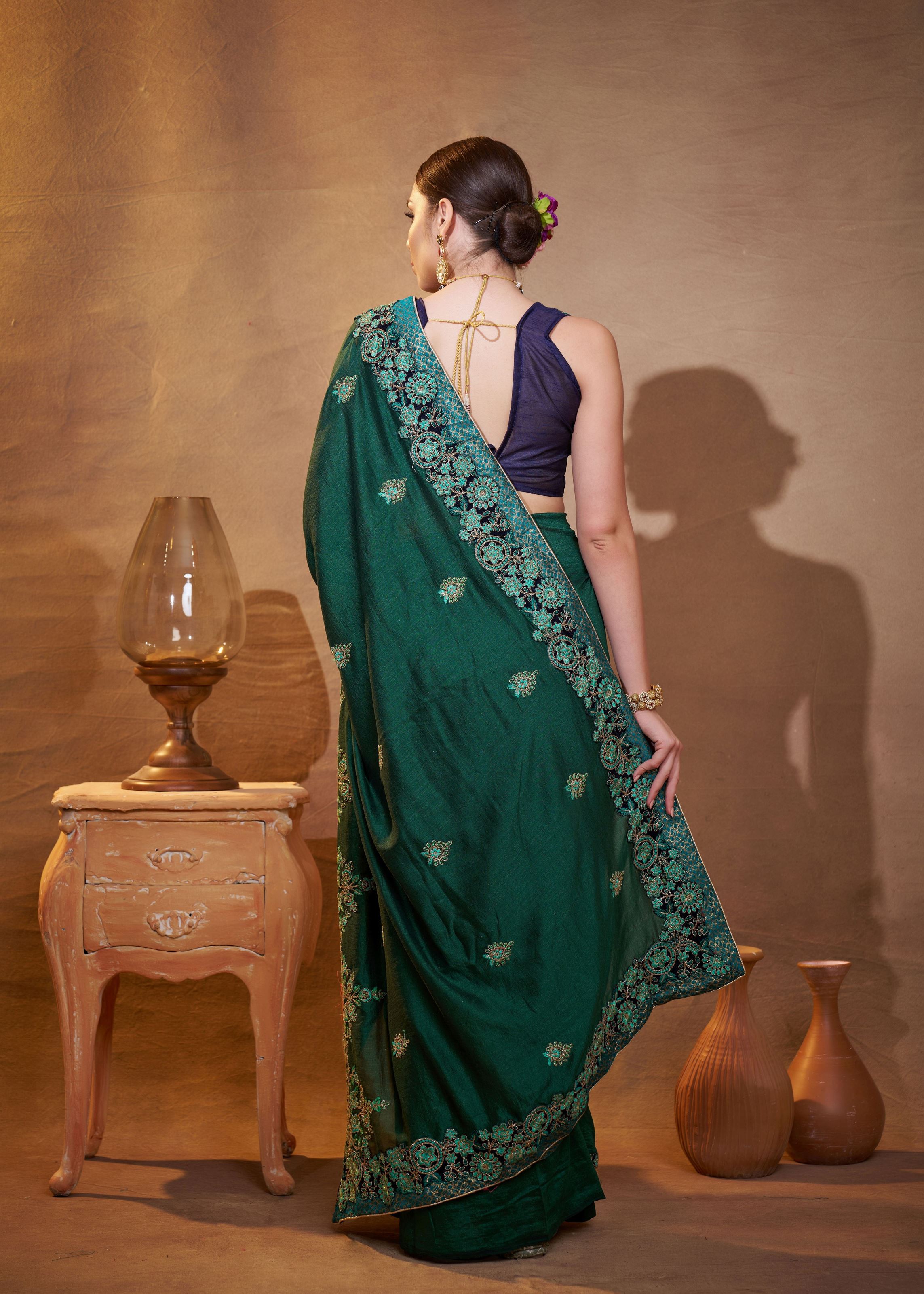 Green Vichitra Silk Designer Embroidery Work Partywear Saree