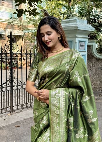 Paired with a matching green silk blouse, this saree ensures a polished and coordinated look. The lightweight yet opulent Banarasi silk fabric drapes effortlessly, providing all-day comfort while enhancing your festive-ready silhouette. Accessorize with statement jewelry, stylish heels, and ethnic accessories to complete a sophisticated ensemble that stands out at any occasion. Designed for women who appreciate authentic silk artistry, this saree merges tradition, opulence, and contemporary style seamlessly.