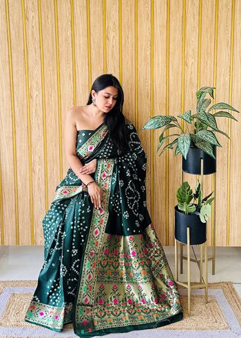 The lush green hue exudes prosperity and vibrance, while the Paithani woven craftsmanship adds a royal and heritage touch. The graceful Bandhej patterns enhance its ethnic charm, creating a striking blend of contemporary appeal and age-old artistry. The shimmering zari borders and elaborately woven pallu give the saree a regal finish, making it ideal for grand celebrations.