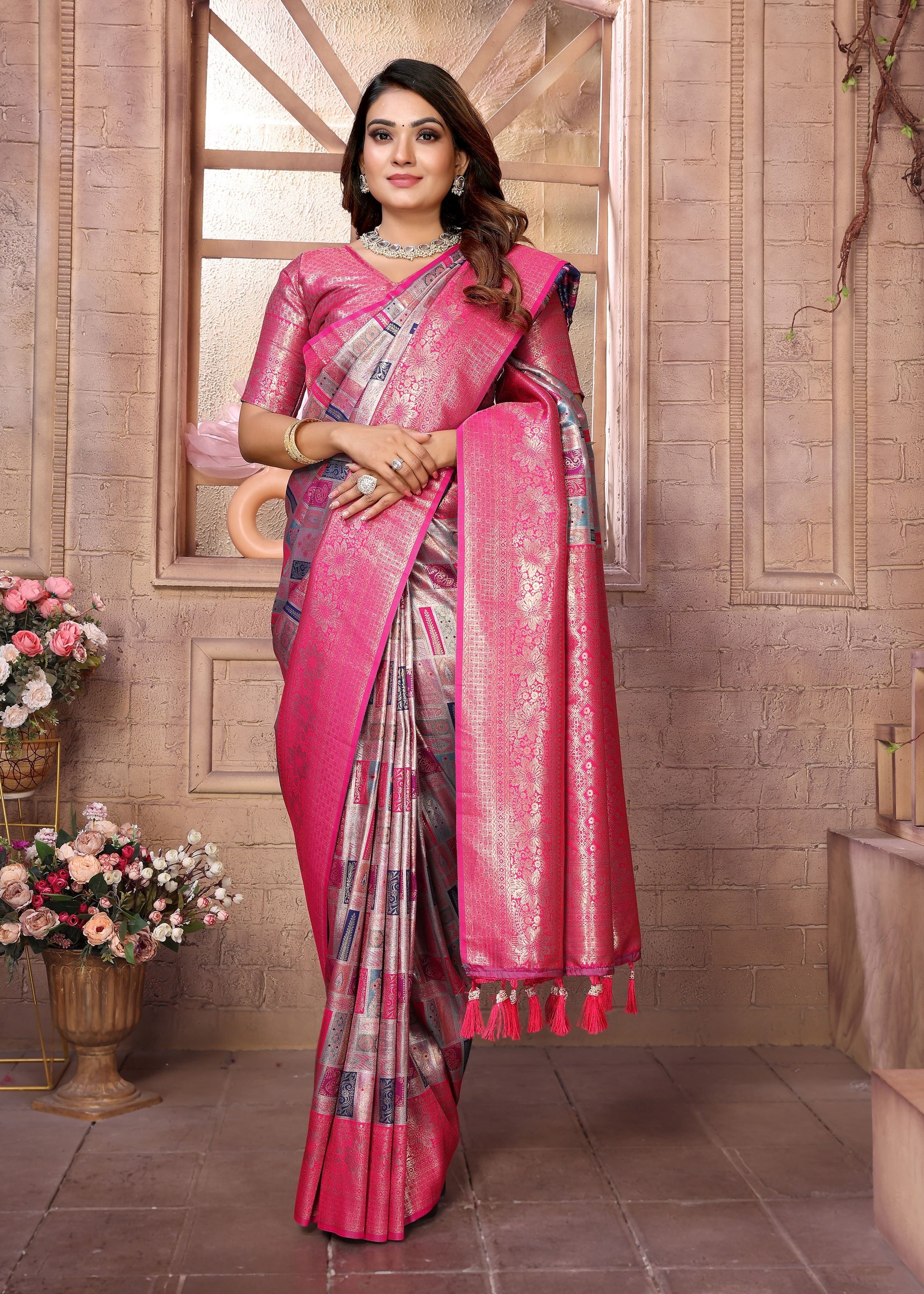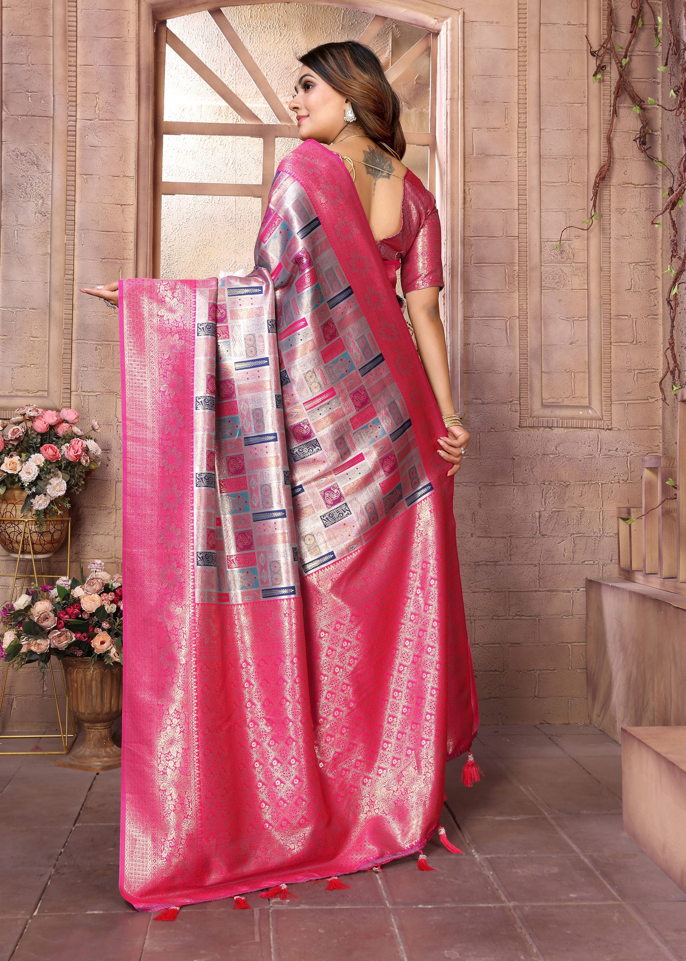 This saree is paired with a contrasting pink silk blend blouse, which adds vibrancy and balance to the muted grey body. The combination of understated elegance and striking detailing makes this saree a versatile choice for women who seek tradition with a fashionable edge. Whether styled with heritage jewelry for a regal look or kept minimal for modern appeal, it promises to elevate your wardrobe.