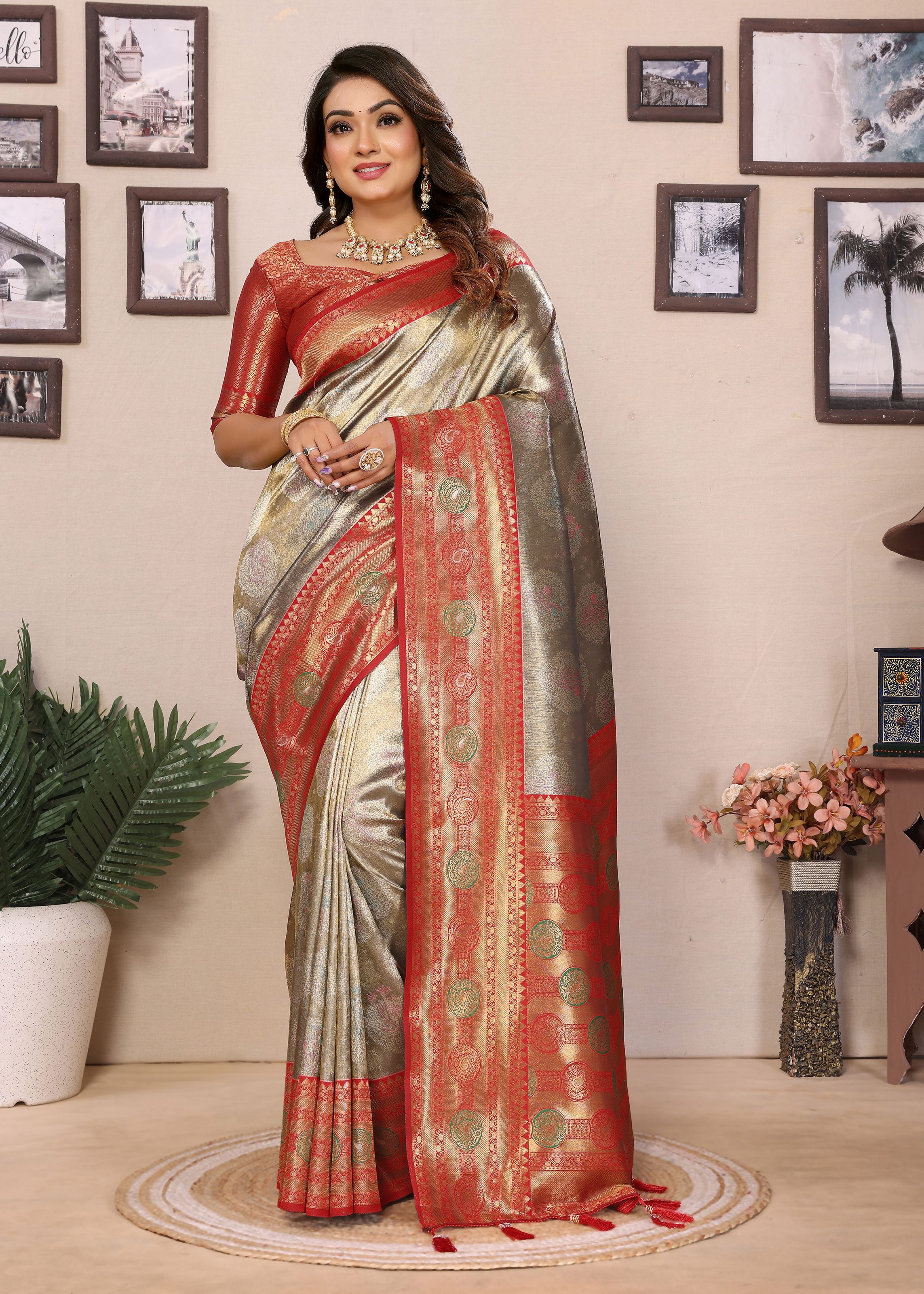 Grey Banarasi Tissue Silk Saree With Woven Paithani Designer