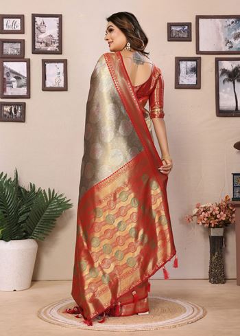 Paired with a contrasting rust silk blend blouse, this saree creates a striking and stylish ensemble perfect for weddings, festive celebrations, and cultural events. The understated grey hue adds a modern touch, while the woven detailing preserves classic ethnic charm, making it a versatile choice for both traditional and modern occasions.
