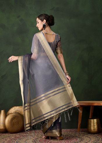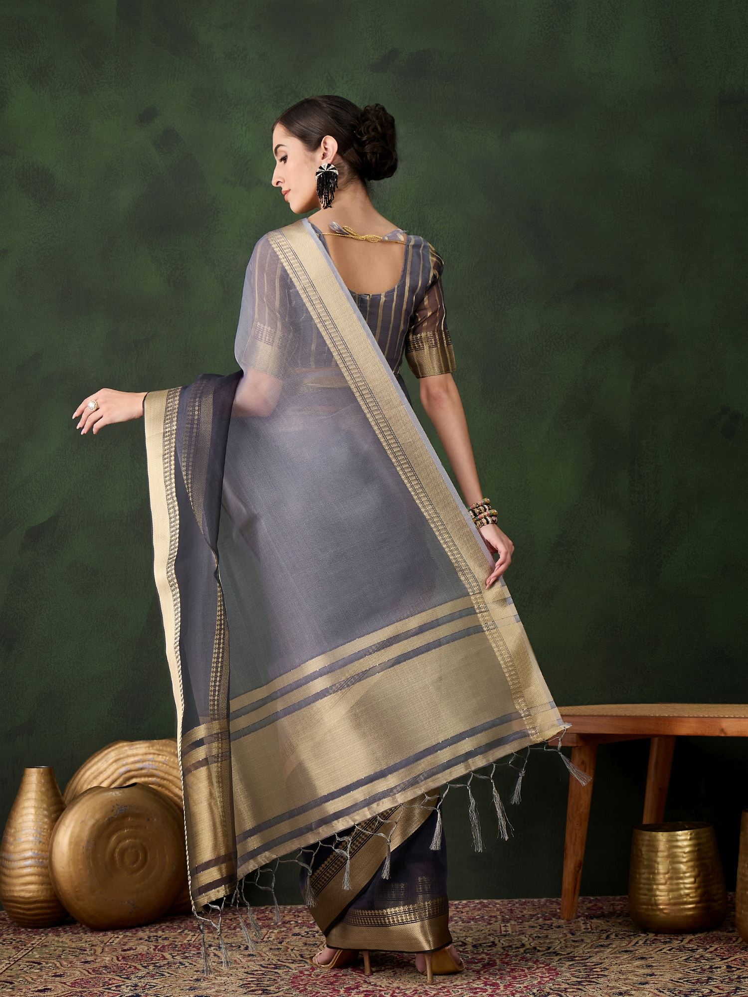Grey Khadi Organza Fabric Beautiful Woven Jacquard Designer Saree