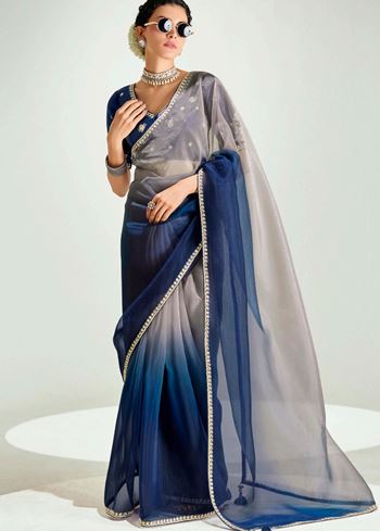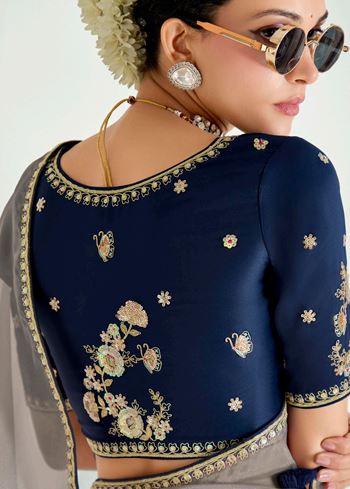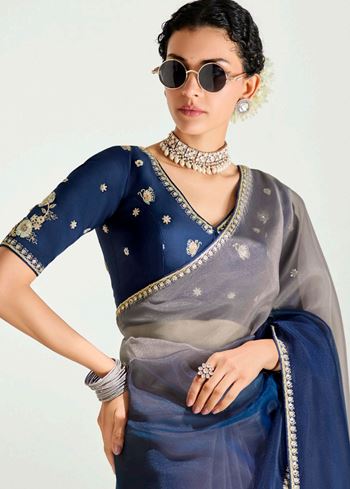 Grey Navy Blue Organza Saree with Embroidered Blouse