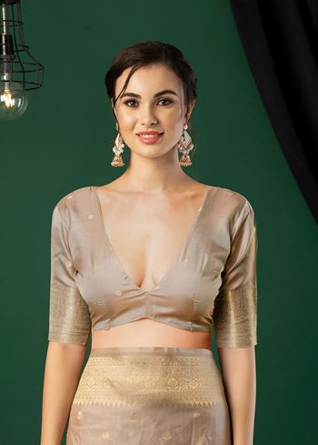 Accompanied by a matching grey art silk blouse, it allows endless styling options—whether you prefer a bold traditional appeal with statement jewelry or a contemporary look with minimalist accessories. Its lightweight yet grand fabric ensures comfort without compromising on glamour, making it suitable for all-day wear.A true symbol of ethnic Indian tradition with designer appeal, this Banarasi jacquard saree is a must-have addition to every woman’s festive wardrobe. Embrace the charm of woven artistry and let your style shine at every celebration.