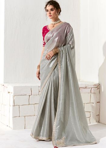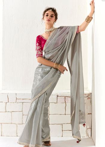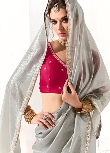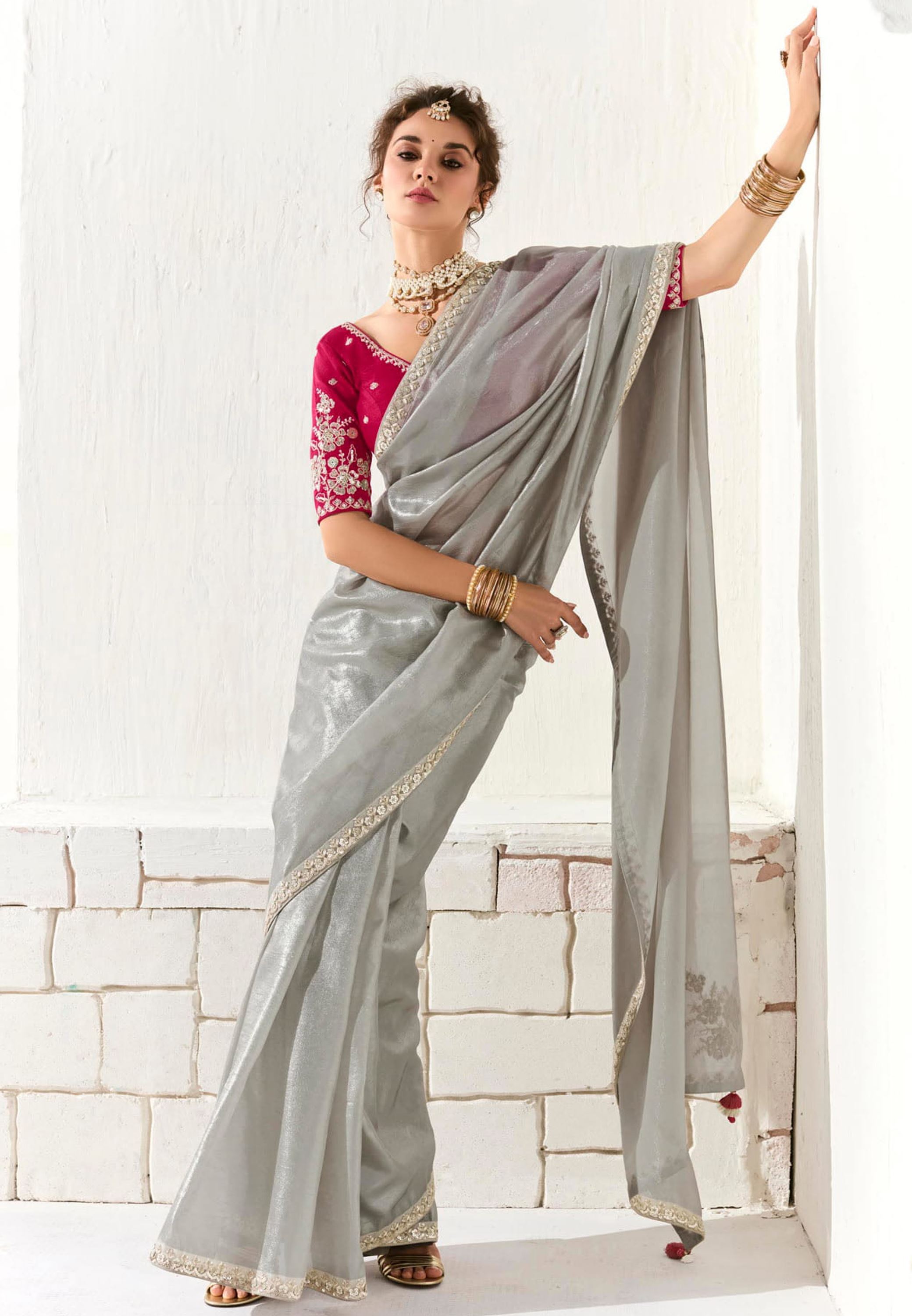 Grey Organza Tissue Saree With Heavy Work Border With Embroidered Blouse