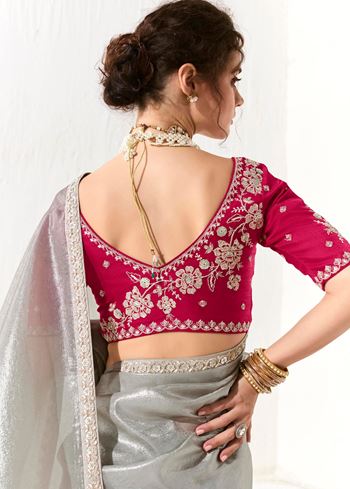 The saree is paired with a beautifully embroidered dark pink organza tissue blouse that provides a vibrant contrast, enhancing the overall look. The fine embroidery on the blouse complements the saree’s detailed border, making it an ideal choice for fashion enthusiasts searching for designer sarees online that blend tradition with contemporary style.