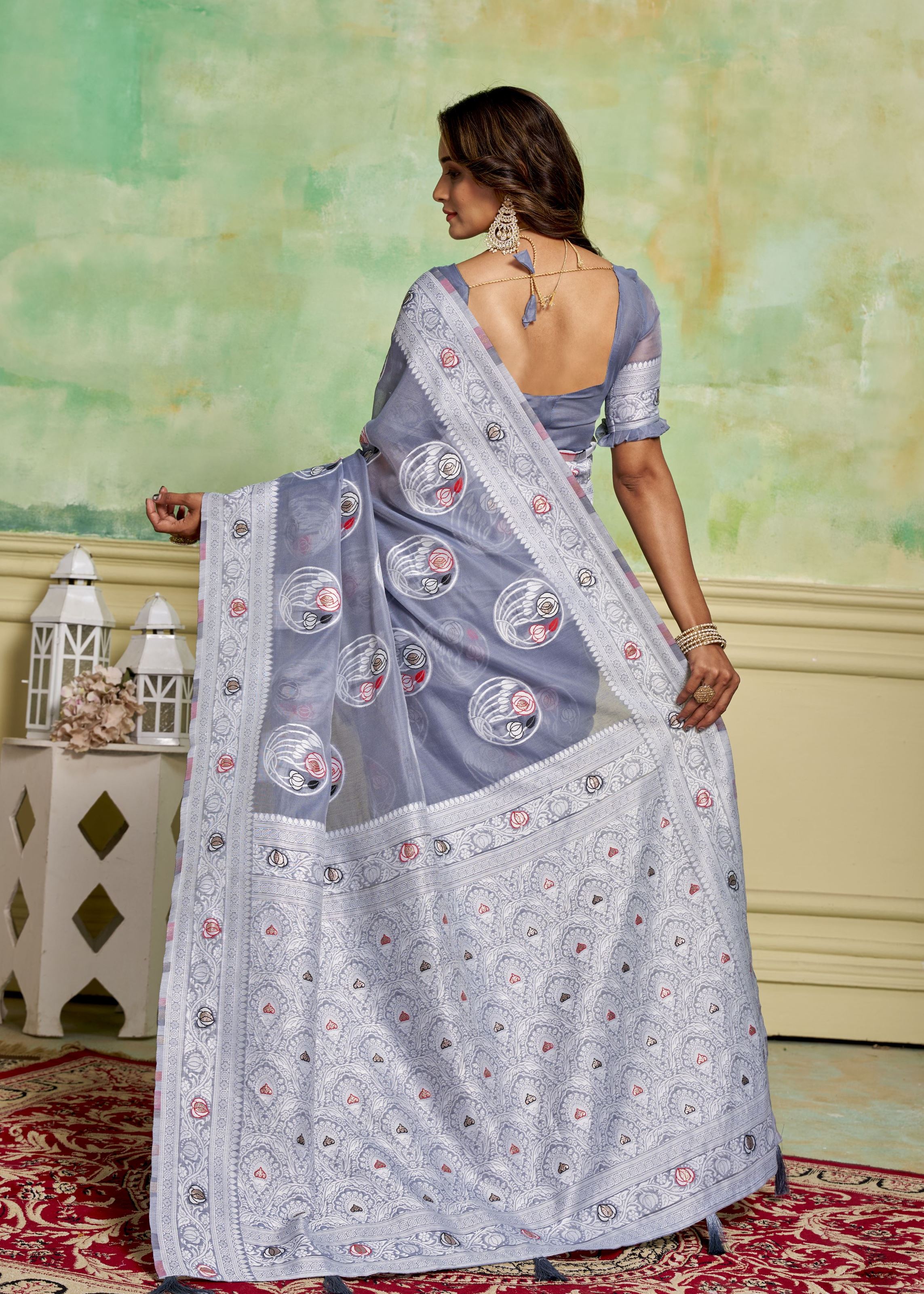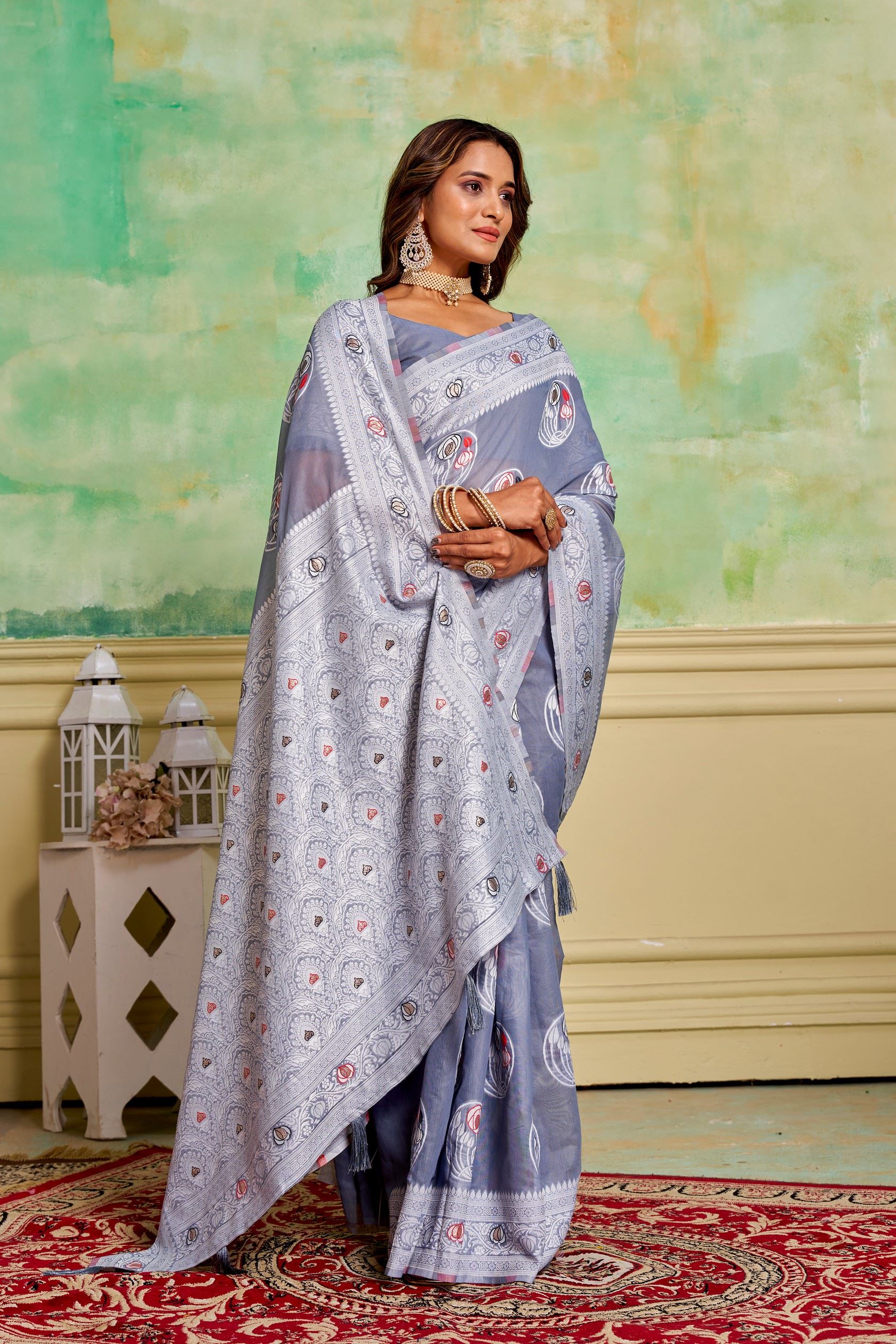 The saree comes with a matching grey cotton blouse, designed to complement the drape seamlessly. Its lightweight fabric allows for effortless styling, giving you the freedom to accessorize with silver, oxidized, or gemstone jewelry for versatile looks. Whether worn at cultural functions, weddings, or formal events, this designer saree ensures timeless appeal and enduring comfort.