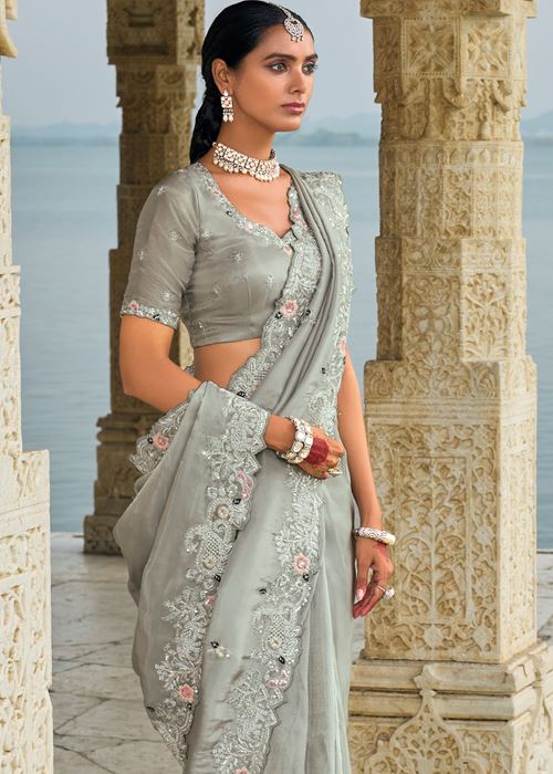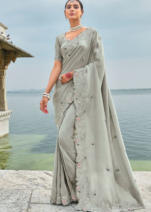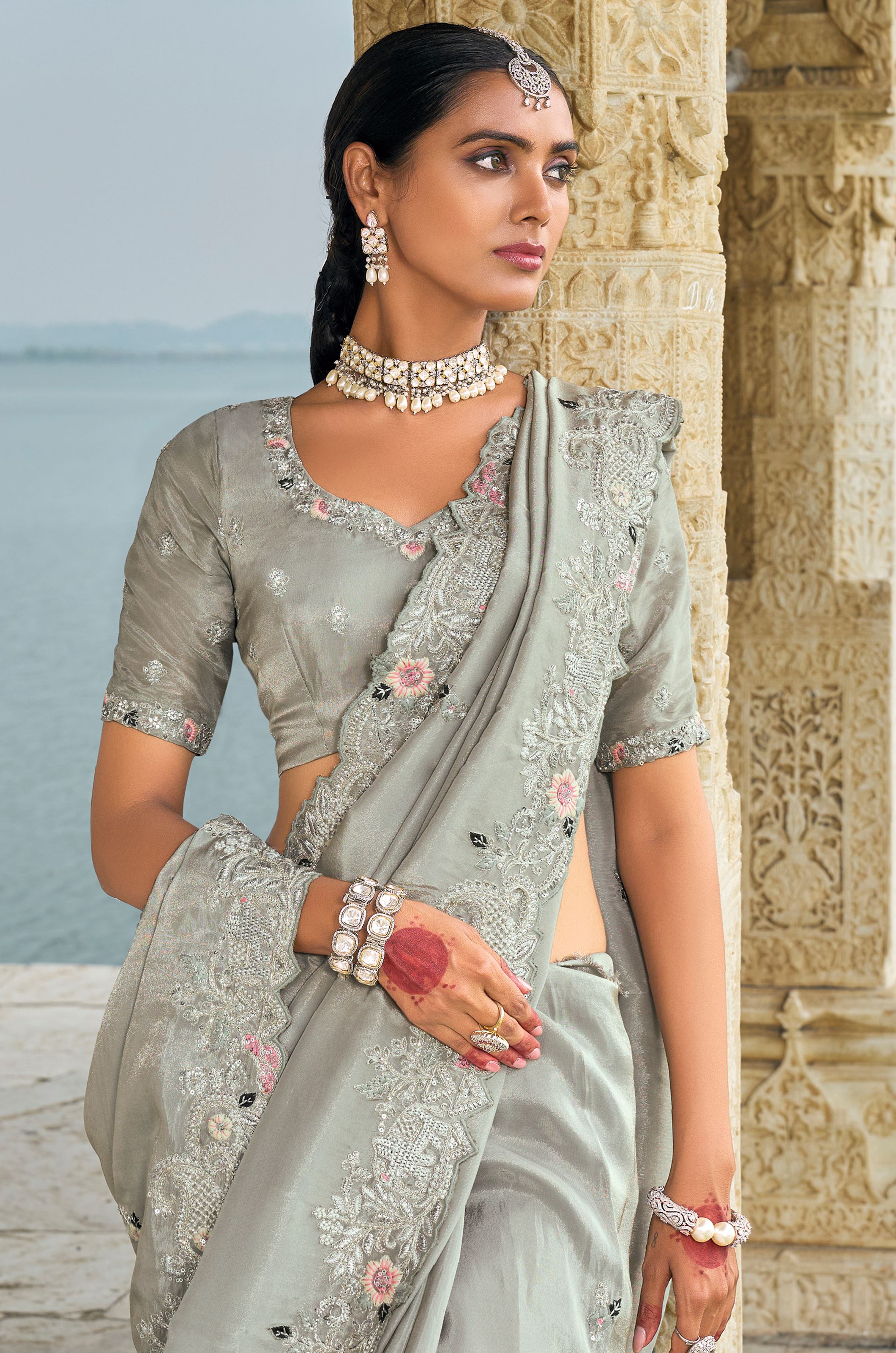 Grey Pure Banarasi Jari Saree With Thread Embroidery, Cut-Dana, Moti With Jarkhan Heavy Work