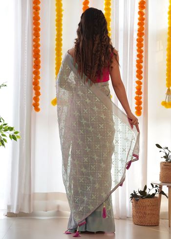 The saree is paired with a contrasting pink art silk blouse, striking the perfect balance between subtle elegance and vibrant charm. The blouse design complements the embroidered detailing on the saree, making it an ideal outfit for weddings, parties, receptions, or ethnic gatherings.