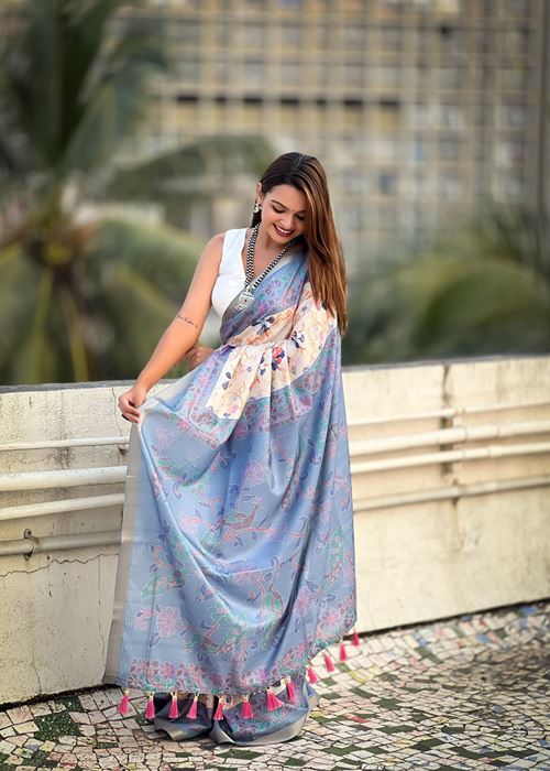 Grey Silk Blend Kalamkari Printed Saree
