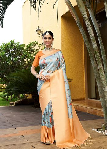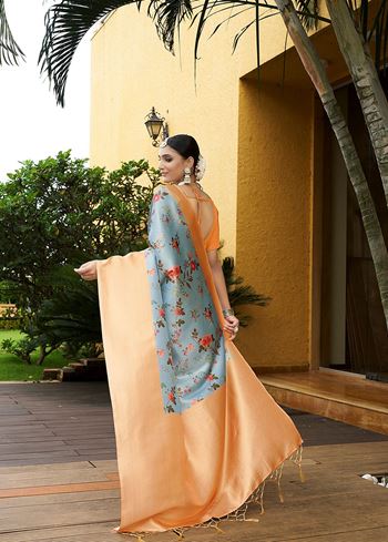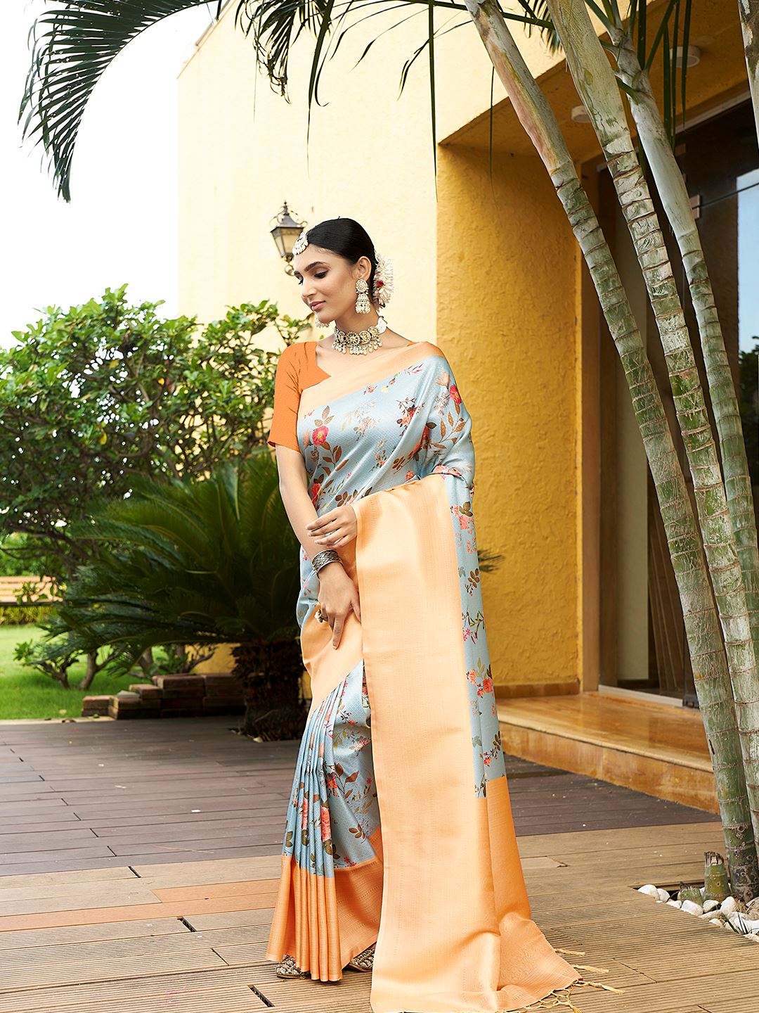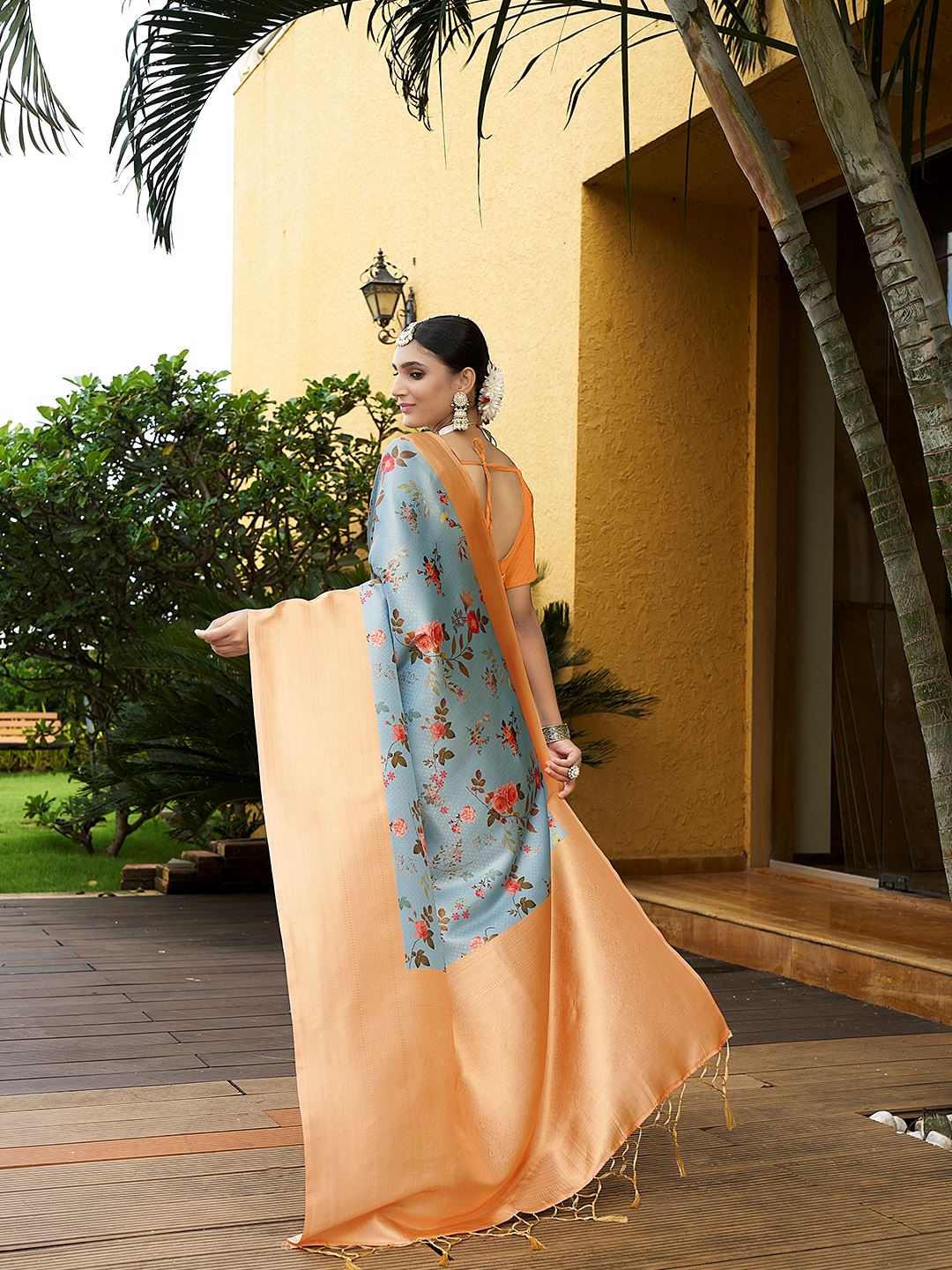 Paired with a contrasting orange crepe blouse, this saree ensures a vibrant and stylish look. The crepe fabric allows for graceful draping while maintaining comfort for long hours of wear. Accessorize with statement jewelry, heels, and a chic clutch to complete a refined ensemble that makes you stand out in any gathering. Its unique combination of woven zari detailing and modern prints makes it perfect for women who appreciate designer ethnic wear with a trendy twist.