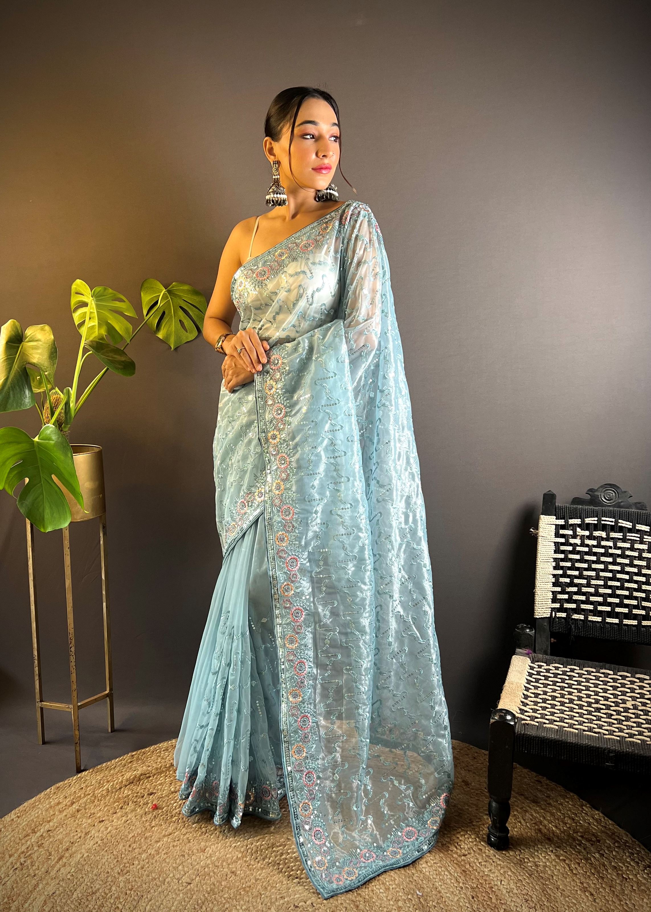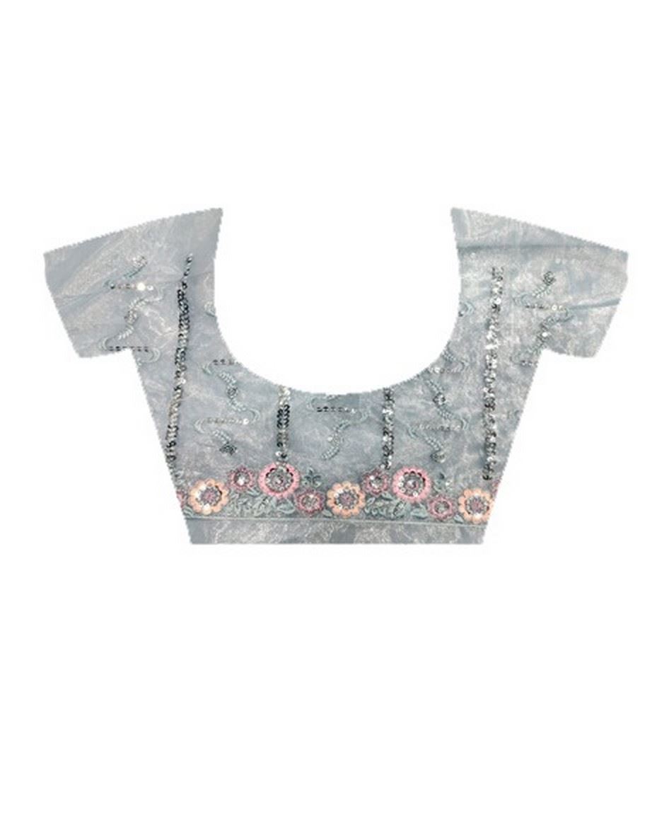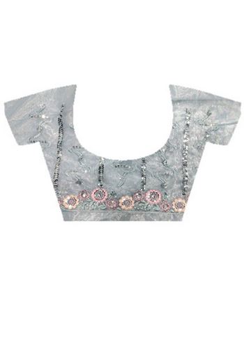 The saree is paired with a matching grey net blouse, enhancing the overall look with a balanced and modern silhouette. Its lightweight texture allows effortless draping while offering comfort, making it ideal for long hours of wear. Pair it with dazzling jewelry and stylish heels to complete a chic, head-turning ensemble. Designed for women who love to blend tradition with trend, this saree is sure to become a statement piece in your wardrobe.