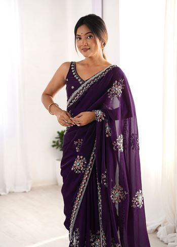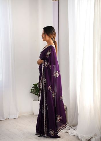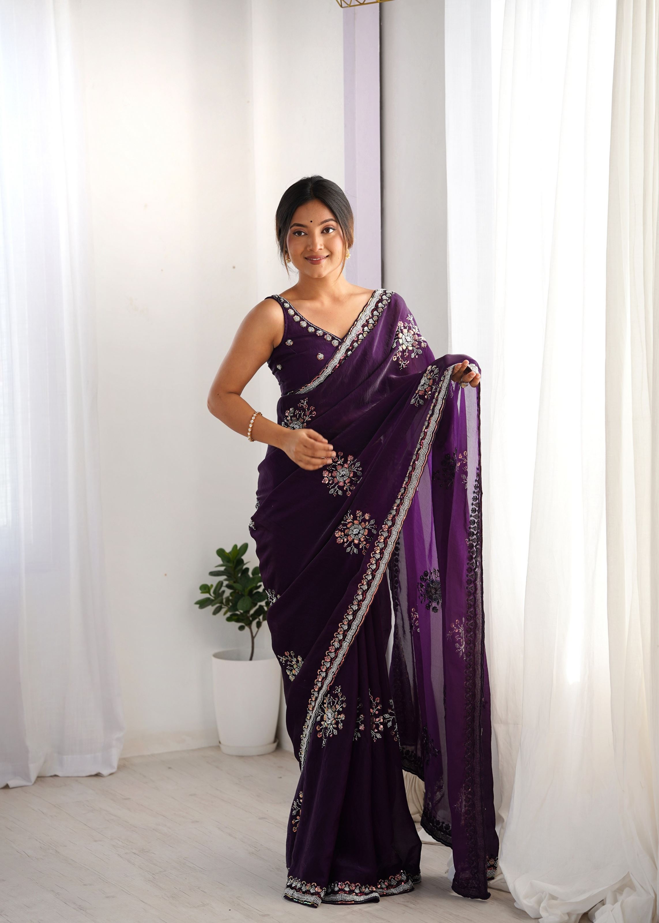 This saree is paired with a matching Satin blouse in purple, ensuring a seamless and stylish look for any festive occasion. The exquisite beadwork detailing enhances the overall sophistication, making it a perfect pick for women who appreciate designer craftsmanship with a modern edge. Pair it with high-end jewelry and a clutch to create a statement look.