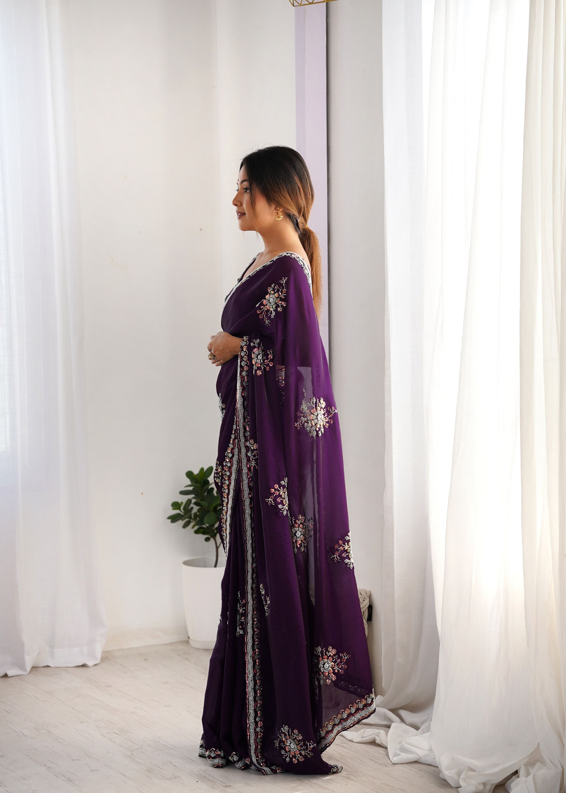 Heavy Designer Beads Hand Work Purple Fendy Satin Heavy Partywear Saree