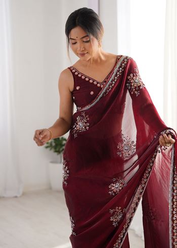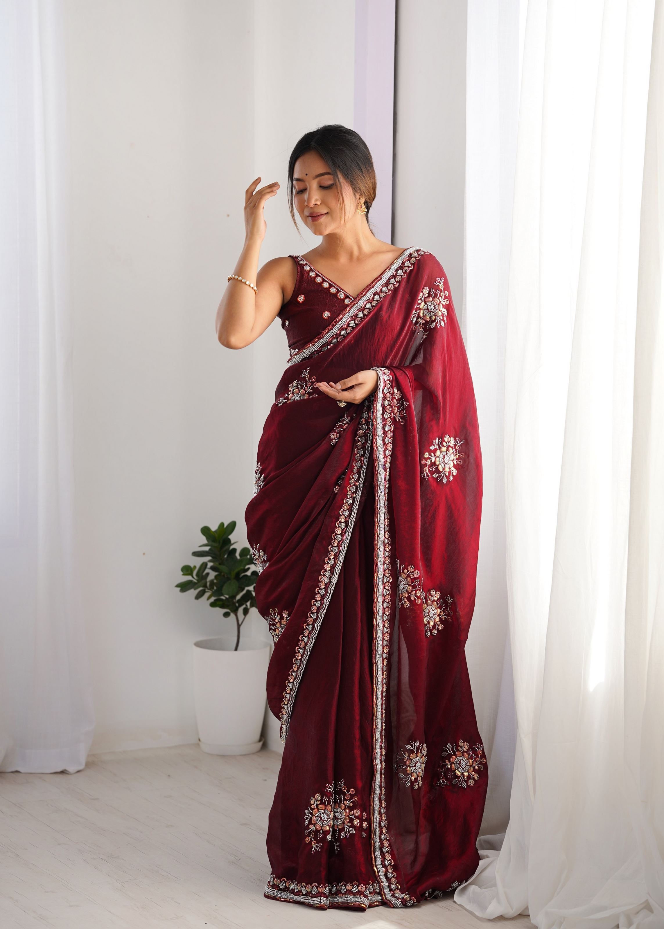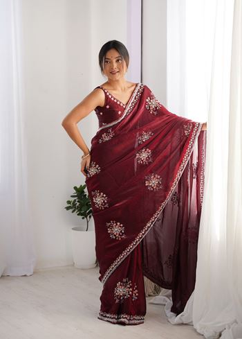 The saree is adorned with intricate hand embroidery and delicate beadwork, reflecting exquisite craftsmanship and designer elegance. It comes paired with a matching wine satin blouse, completing the look with perfect harmony. The meticulous detailing makes this piece a wardrobe essential for fashion-forward women who love ethnic wear with a touch of grandeur.