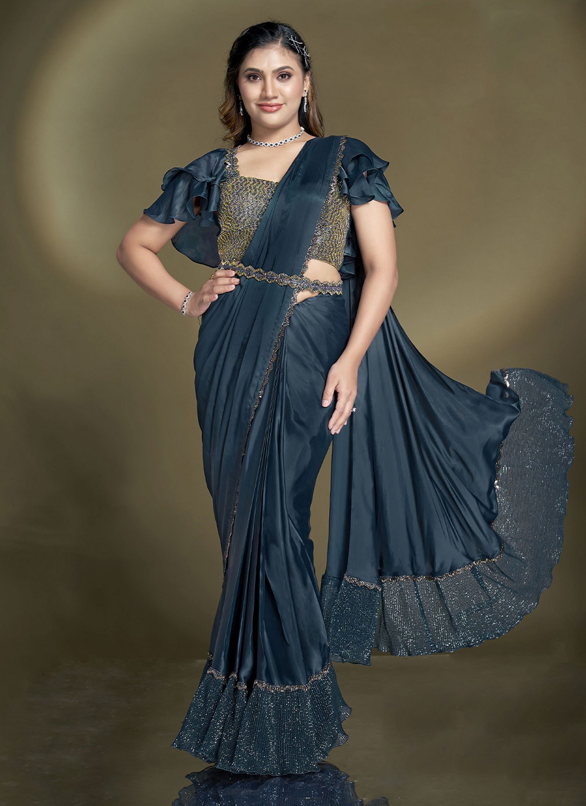 The teal satin saree fabric offers a lustrous finish that drapes gracefully, giving you an effortlessly elegant look. Intricate hand-embroidered sequins and beads work enhances the richness of the design, making it ideal for modern women who appreciate traditional craftsmanship. The saree comes with a matching crepe blouse in teal, ensuring a perfect color-coordinated look.