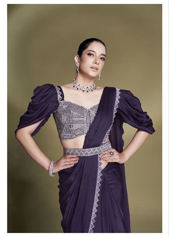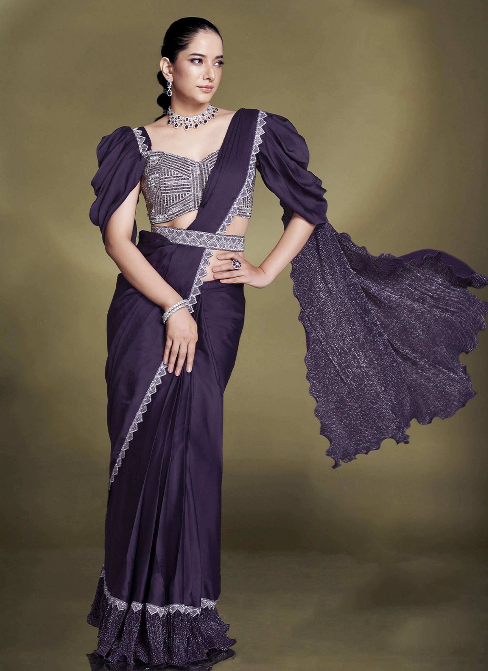 The rich purple satin fabric exudes a luxurious sheen, draping beautifully for a regal look. The hand-embroidered detailing with sequins and beads adds an extra layer of charm, making it an ideal choice for women who want to shine at special occasions. It comes with a matching crepe blouse in purple, ensuring comfort and style.