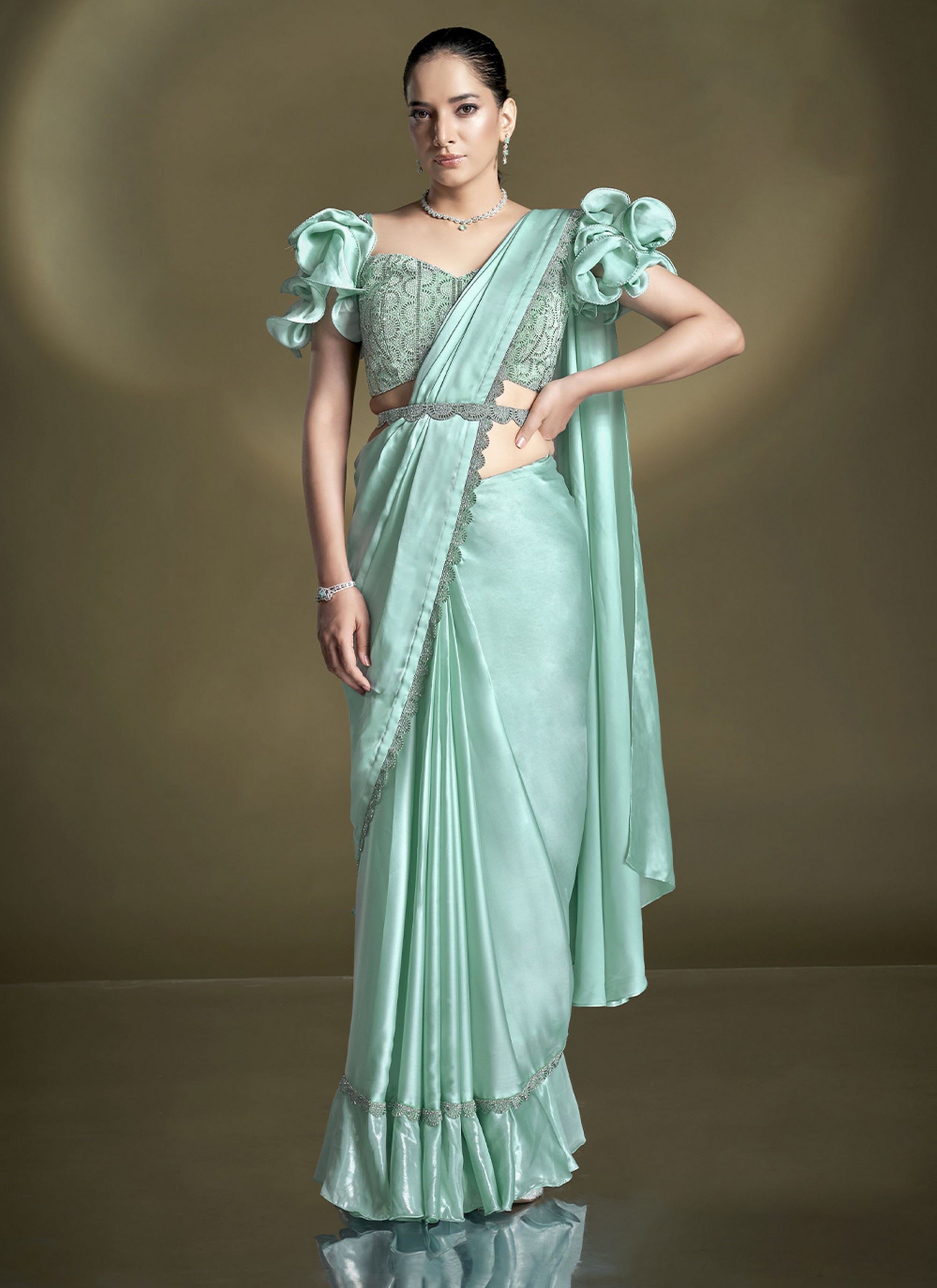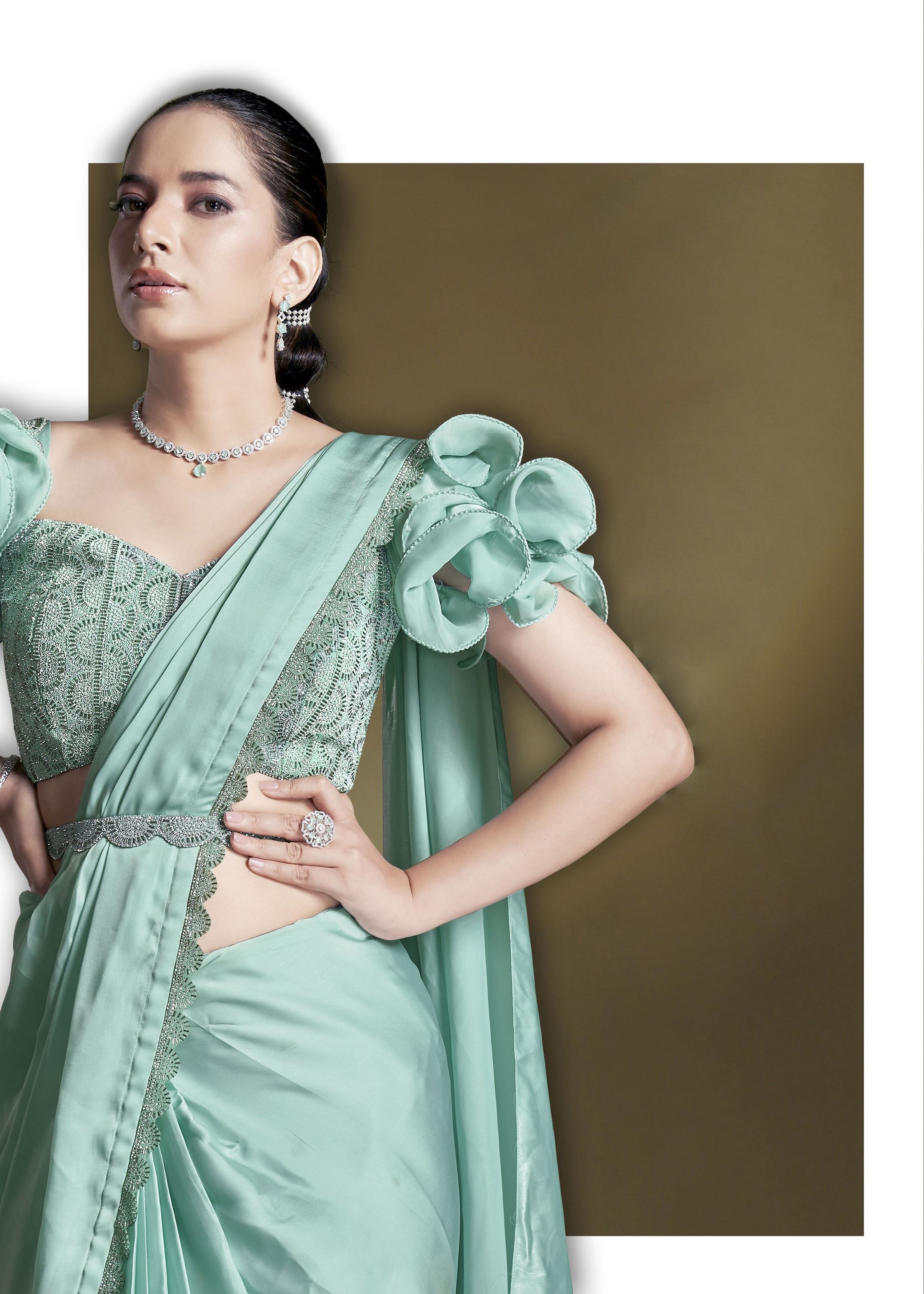 Elevate your ethnic collection with this Heavy Partywear Crepe Satin Silk Saree in a refreshing Sea Green hue. Perfect for weddings, festive occasions, and glamorous parties, this saree brings together luxury, tradition, and contemporary charm.