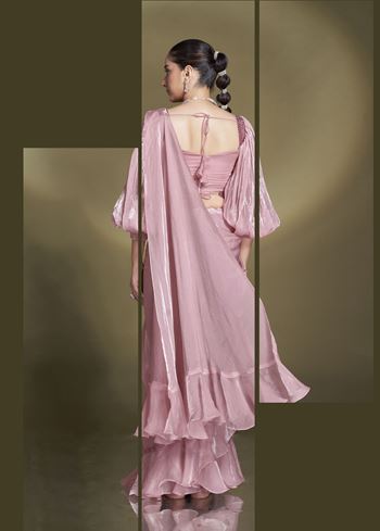 The stunning pink hue with two-tone satin effect adds depth and sophistication, while the exquisite hand embroidery with sequins and beads ensures a rich, regal look. The saree comes with a matching crepe blouse in pink, complementing the overall ensemble perfectly. Designed for modern women who value comfort and style, this saree is ready to wear, saving you time while delivering a flawless drape.