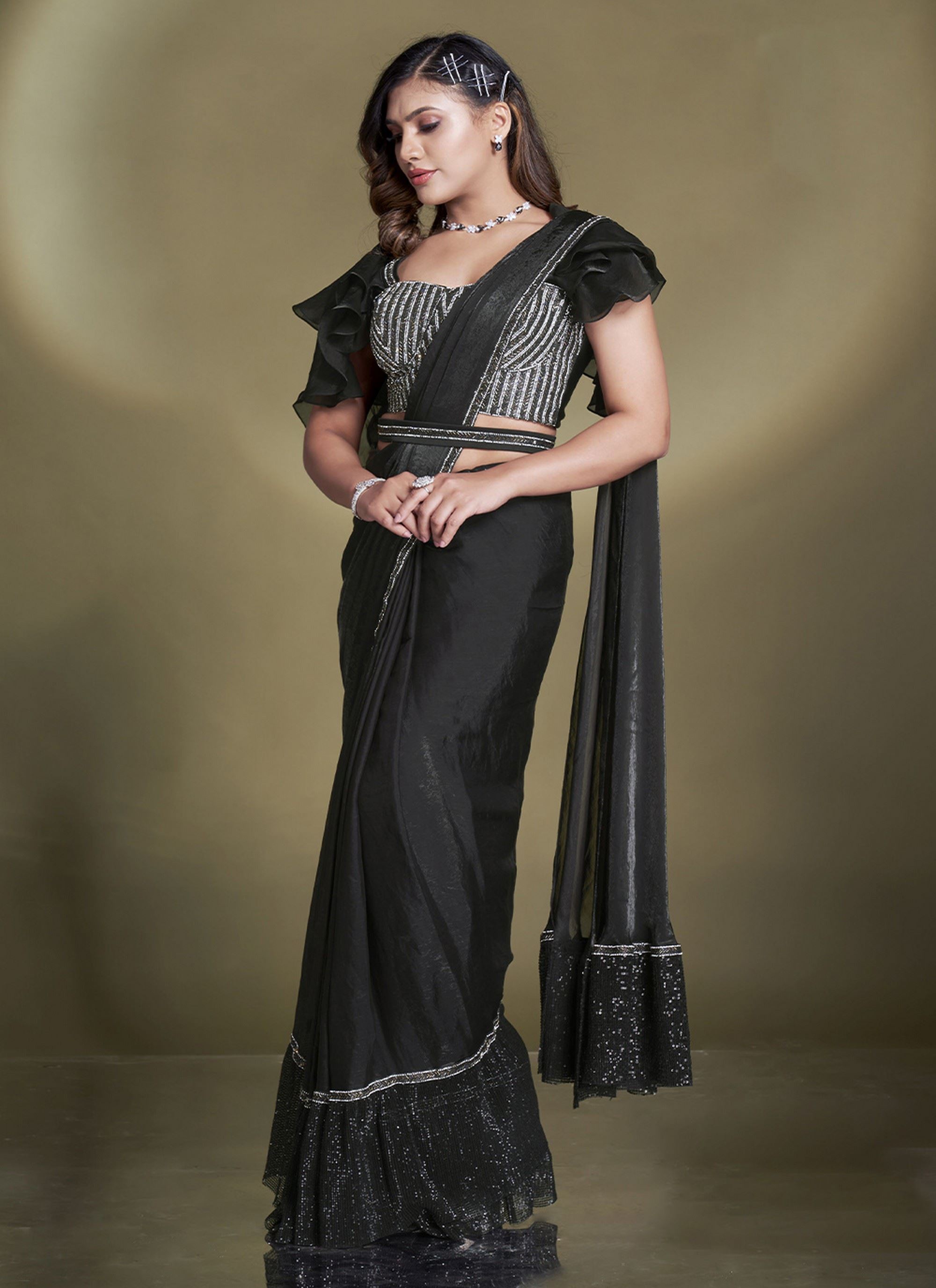 The luxurious black satin fabric offers a smooth, glossy finish that drapes beautifully, creating an elegant silhouette. The intricate handcrafted embellishments of sequins and beads add a sparkling touch of sophistication. This saree comes with a matching crepe blouse in black, ensuring a perfect and cohesive ensemble.Being ready to wear, it saves time while keeping you stylish for any grand celebration. Pair it with statement jewelry, metallic stilettos, and an embellished clutch to complete your look. Whether it’s an evening gala or a wedding reception, this saree will make you stand out effortlessly.Shop now from Aethnofit Fashions and enjoy secure worldwide delivery, along with custom blouse stitching service for just $1 for a perfect designer fit.