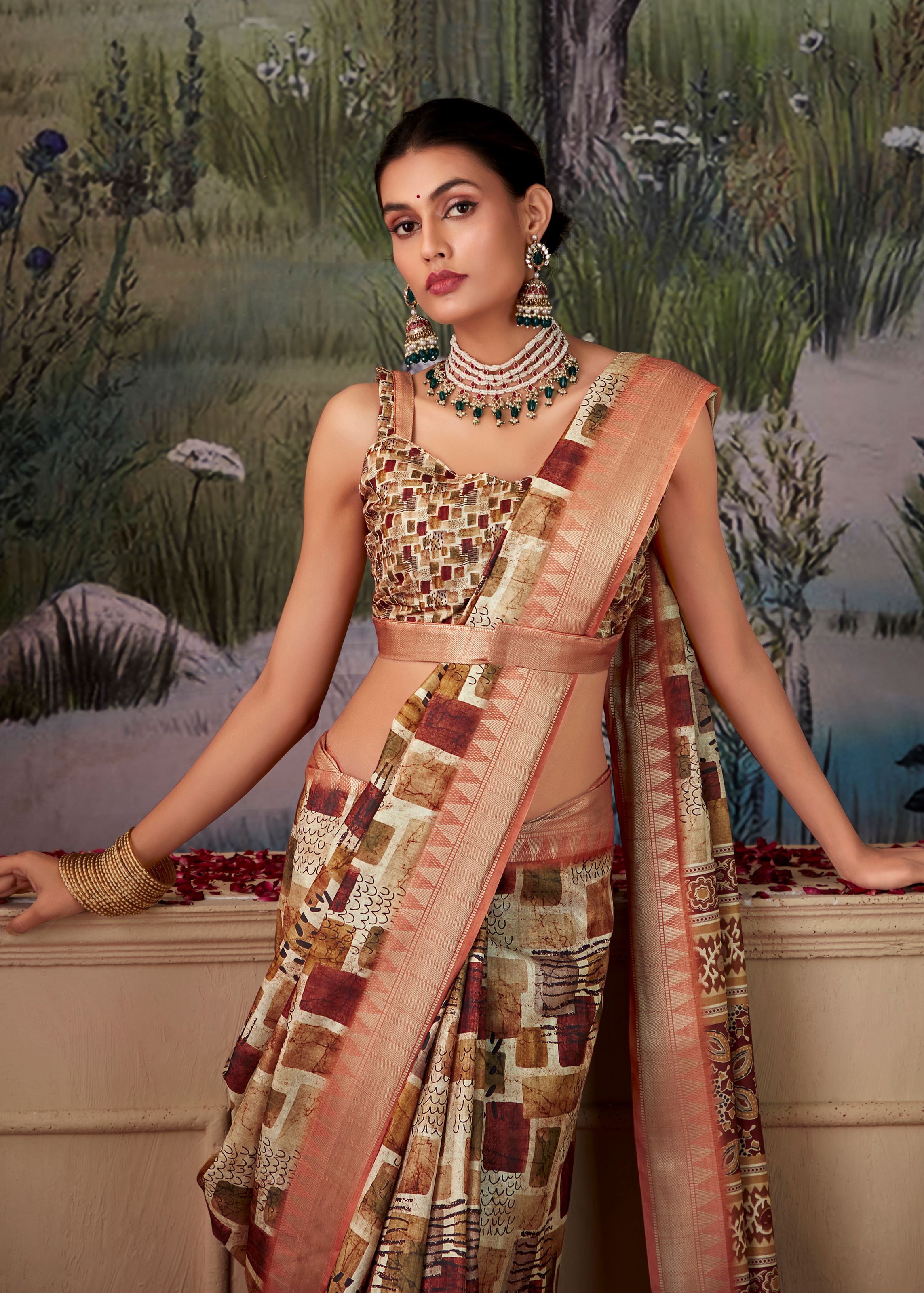 Ivory Tusser Silk Saree With Jacquard Woven with Digital Print