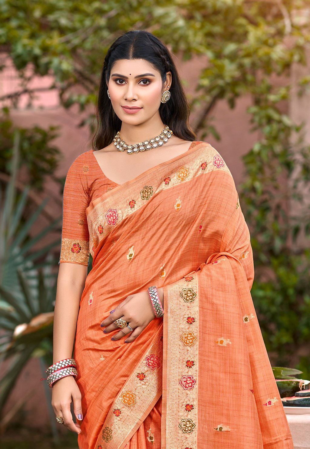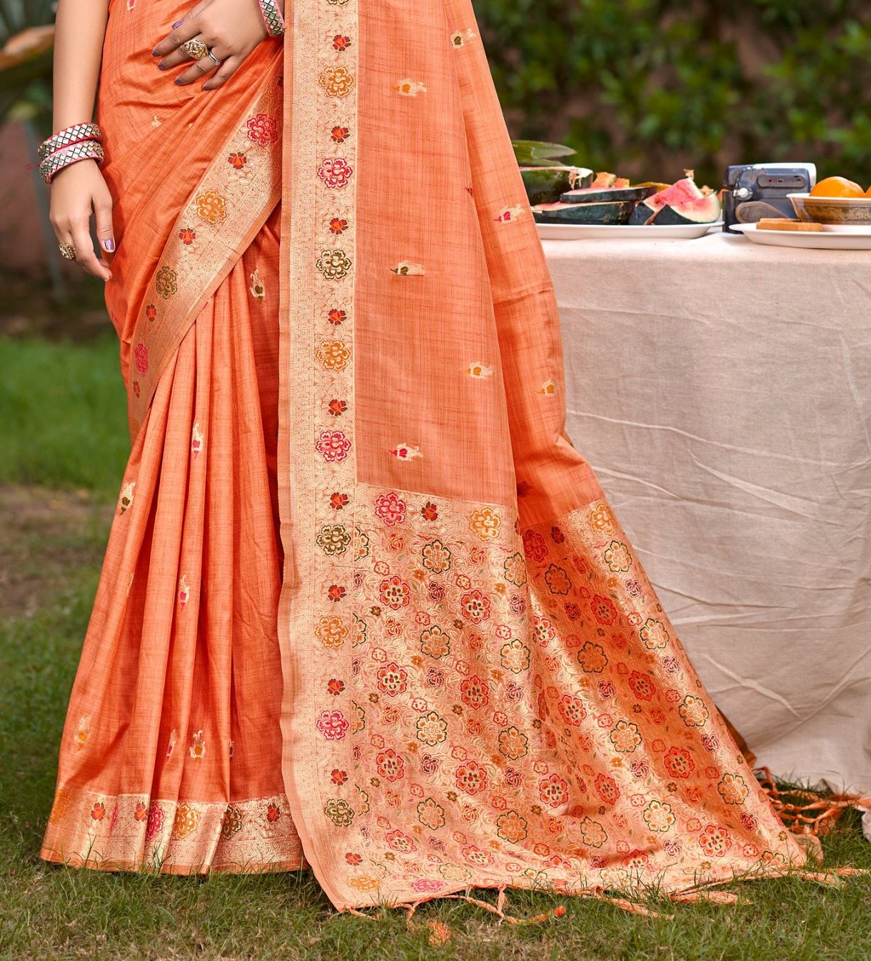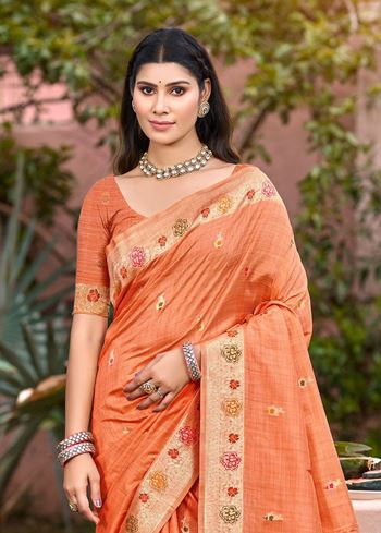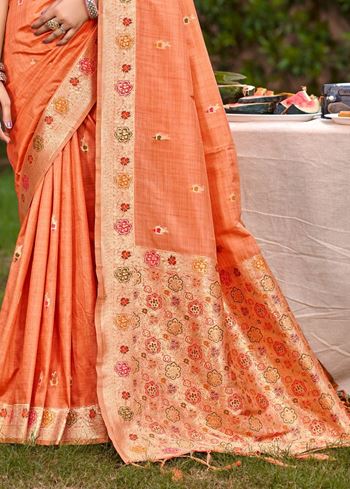 Jewel-Toned Orange Assam Silk Meenakari Festival Saree