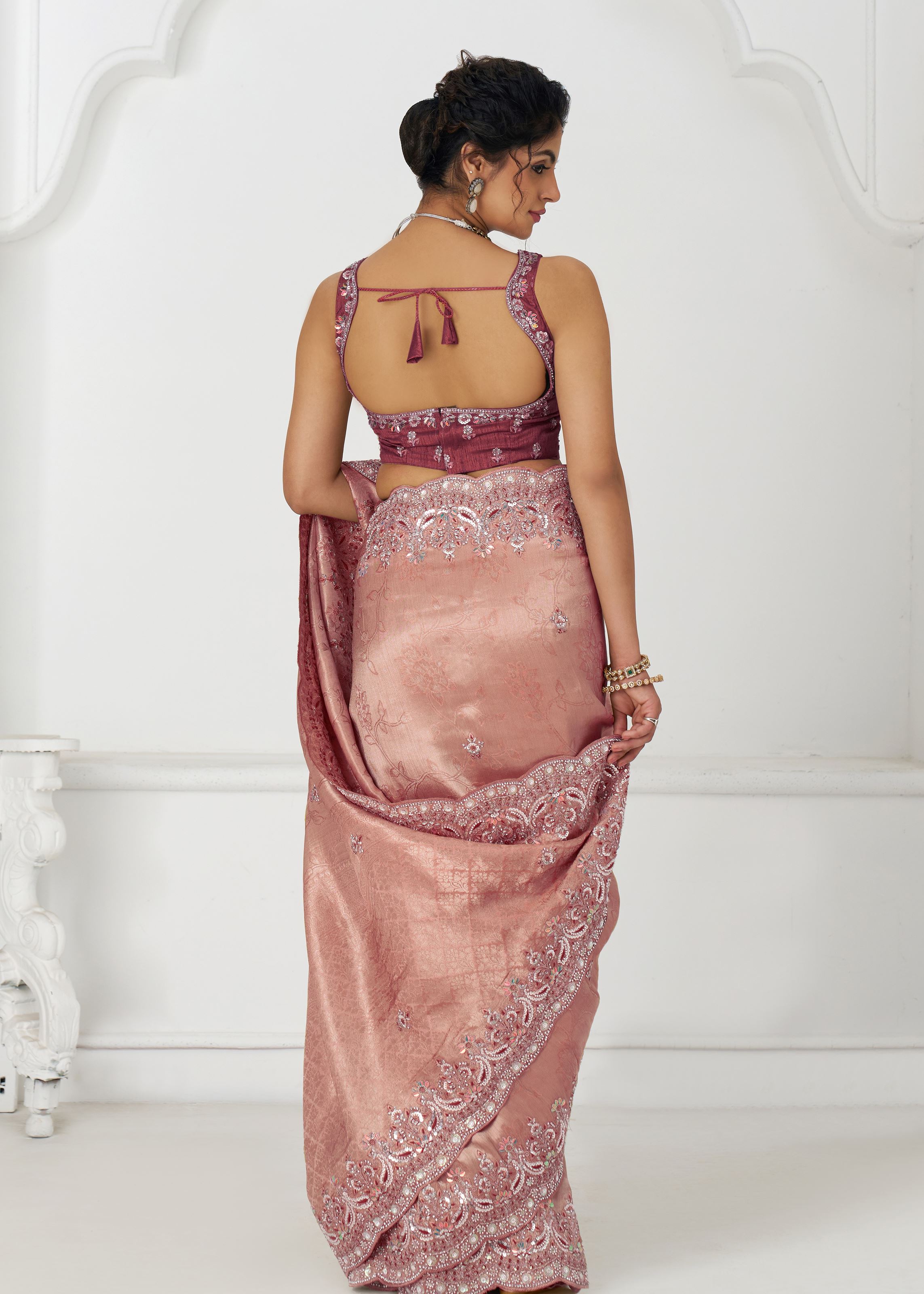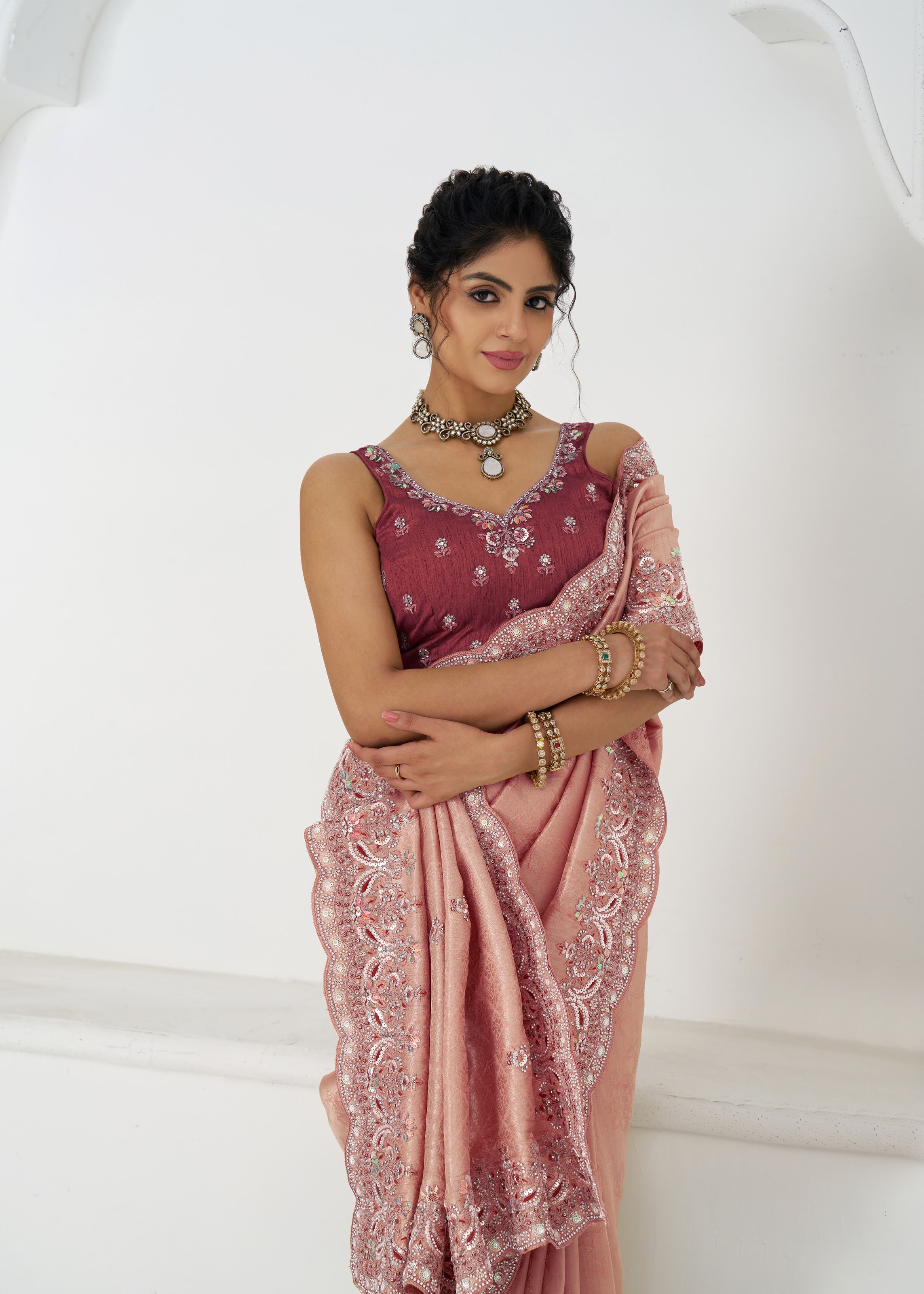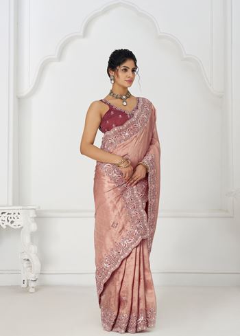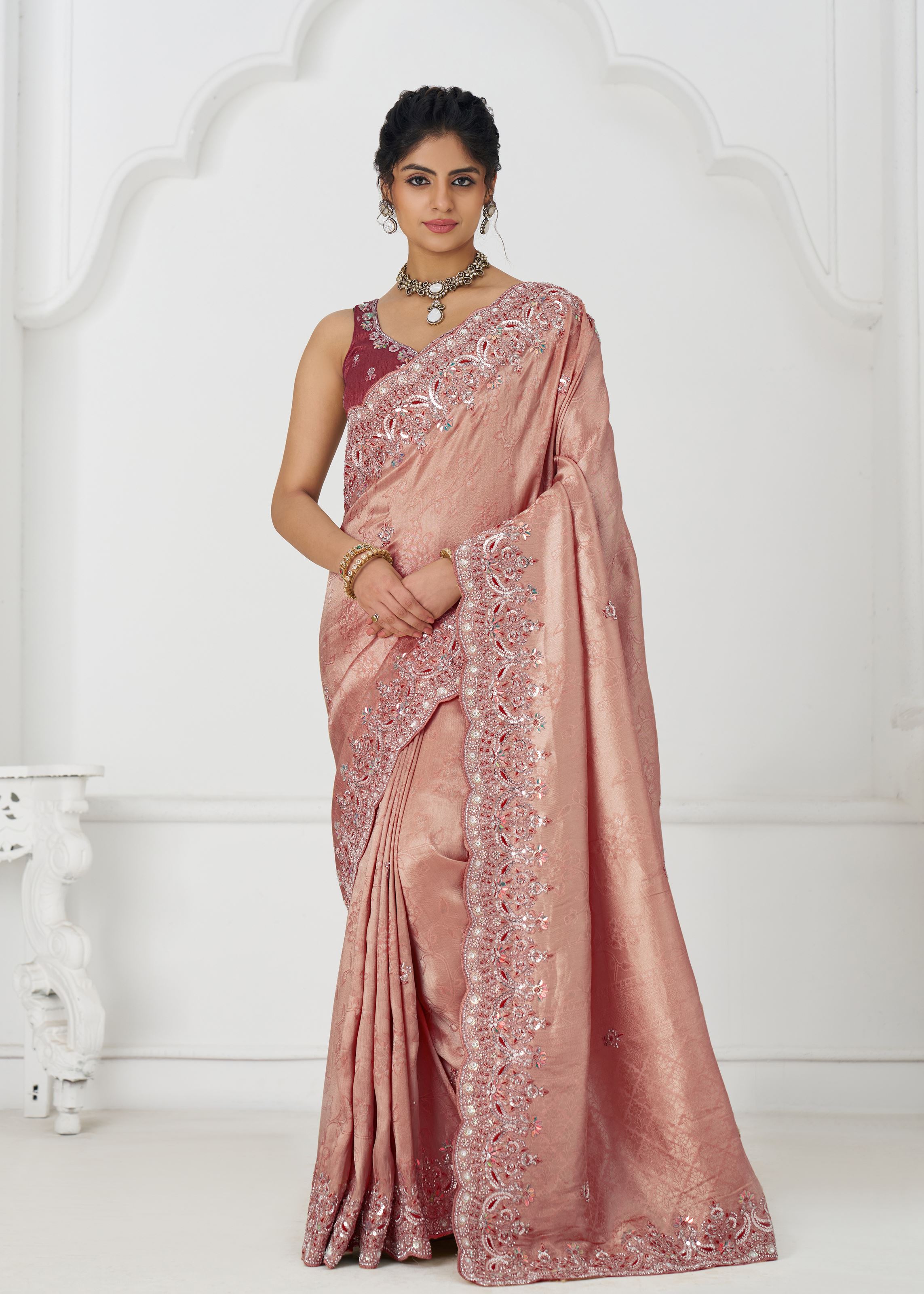 Latest Pink Pure Dola Viscouse Silk Saree With Sequins And Beads Embroidery For Brides