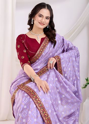 Lavender Vichitra Silk Saree with Golden Foil Bandhani Print and Embroidery Lace Work