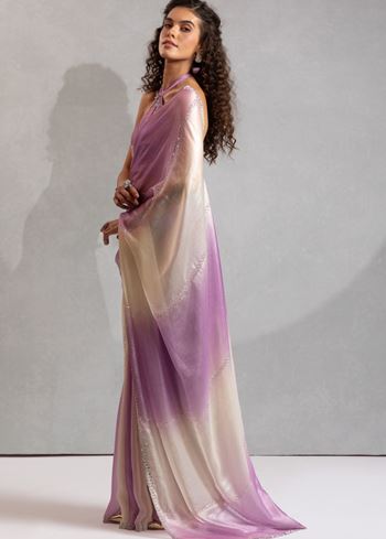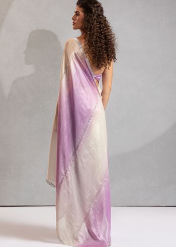 Lavender and Cream Satin Saree with Hand Work and Beaded Border