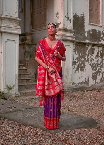 The soft yet enchanting lavender shade brings a modern twist to the timeless Banarasi weave, offering a refreshing color that suits both day and evening celebrations. Its intricate woven zari work adds a royal charm, enhancing the saree with a rich ceremonial look. Each motif reflects the finesse of age-old Banarasi artistry, making this saree not just attire, but a statement of tradition and luxury.