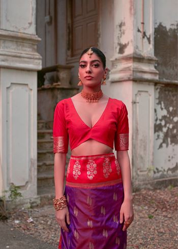 To complete the look, the saree is paired with a contrasting red silk blend blouse, creating a striking balance of subtlety and vibrancy. The lightweight drape ensures graceful fall and effortless wear, keeping you comfortable while radiating elegance.Style this saree with traditional gold jewelry, a Kundan choker, or statement bangles to highlight its grandeur. Pair with embellished sandals or juttis for a complete festive look. Perfect for ceremonies, festive gatherings, or cultural occasions, this saree is designed to make every moment memorable.
