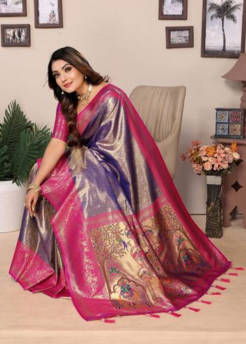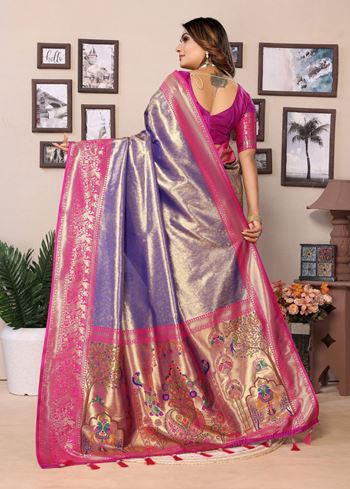 The soft lavender base is beautifully paired with a contrasting pink silk blend blouse, creating a refined and elegant ensemble. Its luxurious tissue silk fabric drapes gracefully, highlighting the detailed woven Jari patterns while ensuring comfort and a flattering fit. Designed for women who appreciate authentic craftsmanship and traditional elegance, this designer saree makes a striking statement at bridal functions, festive gatherings, and special celebrations.