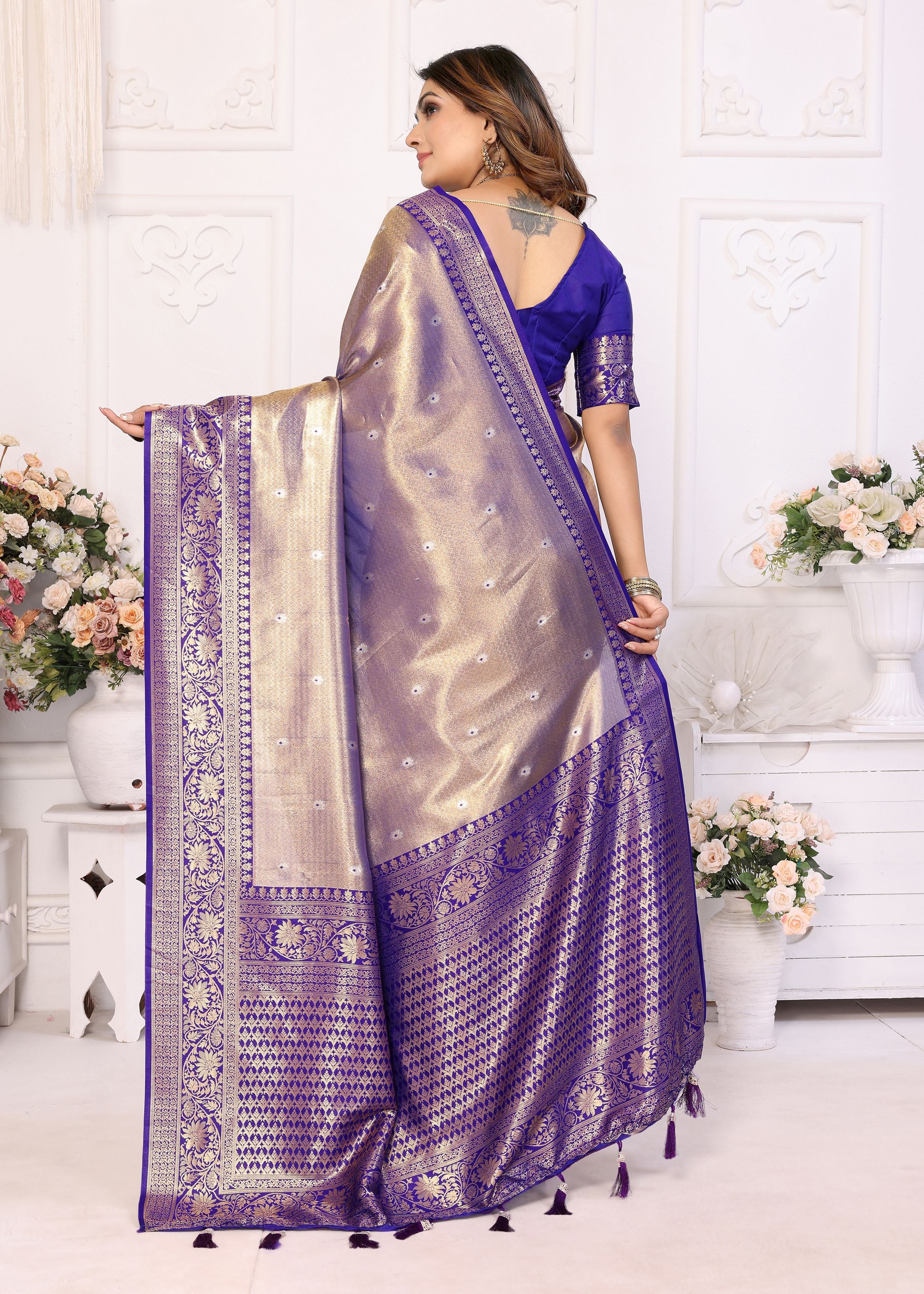 Perfect for bridesmaids, festive wear, or cultural celebrations, this saree pairs wonderfully with diamond, pearl, or antique gold jewelry. Its soft sheen and detailed weaving ensure you radiate a timeless royal appeal with every step.The Lavender Banarasi Tissue Silk Saree is not just an outfit—it’s a blend of heritage and elegance, designed for the modern woman who loves tradition with a touch of luxury.