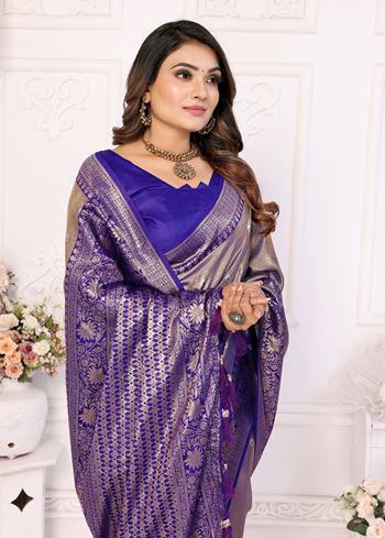 The soothing lavender hue exudes sophistication and charm, creating a refreshing aura that sets you apart in weddings, receptions, or festive gatherings. The highlight of this ensemble is the intricate woven jari work, showcasing the fine artistry of Banarasi weaving. Its lustrous golden patterns beautifully contrast with the pastel base, adding regal glamour to the ensemble.
